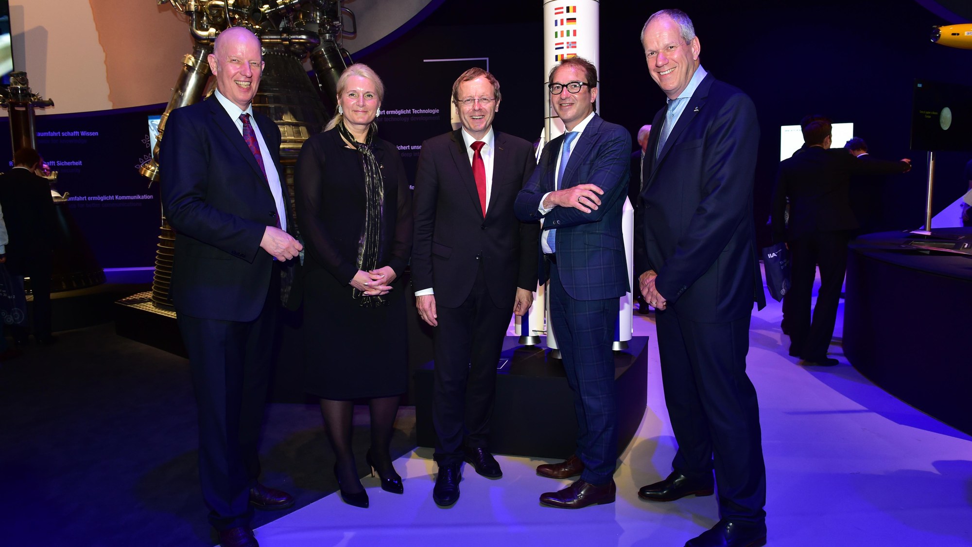 Von links nach rechts: Dr. Gerd Gruppe, DLR-Vorstand für das Raumfahrtmanagement, Prof. Pascale Ehrenfreund, DLR-Vorstandsvorsitzende, Prof. Dr.-Ing. Johann-Dietrich Wörner, ESA-Generaldirektor, Alexander Dobrindt, Bundesverkehrsminister, und Evert Dudok, BDLI-Vizepräsident, vor dem Modell der Ariane 6