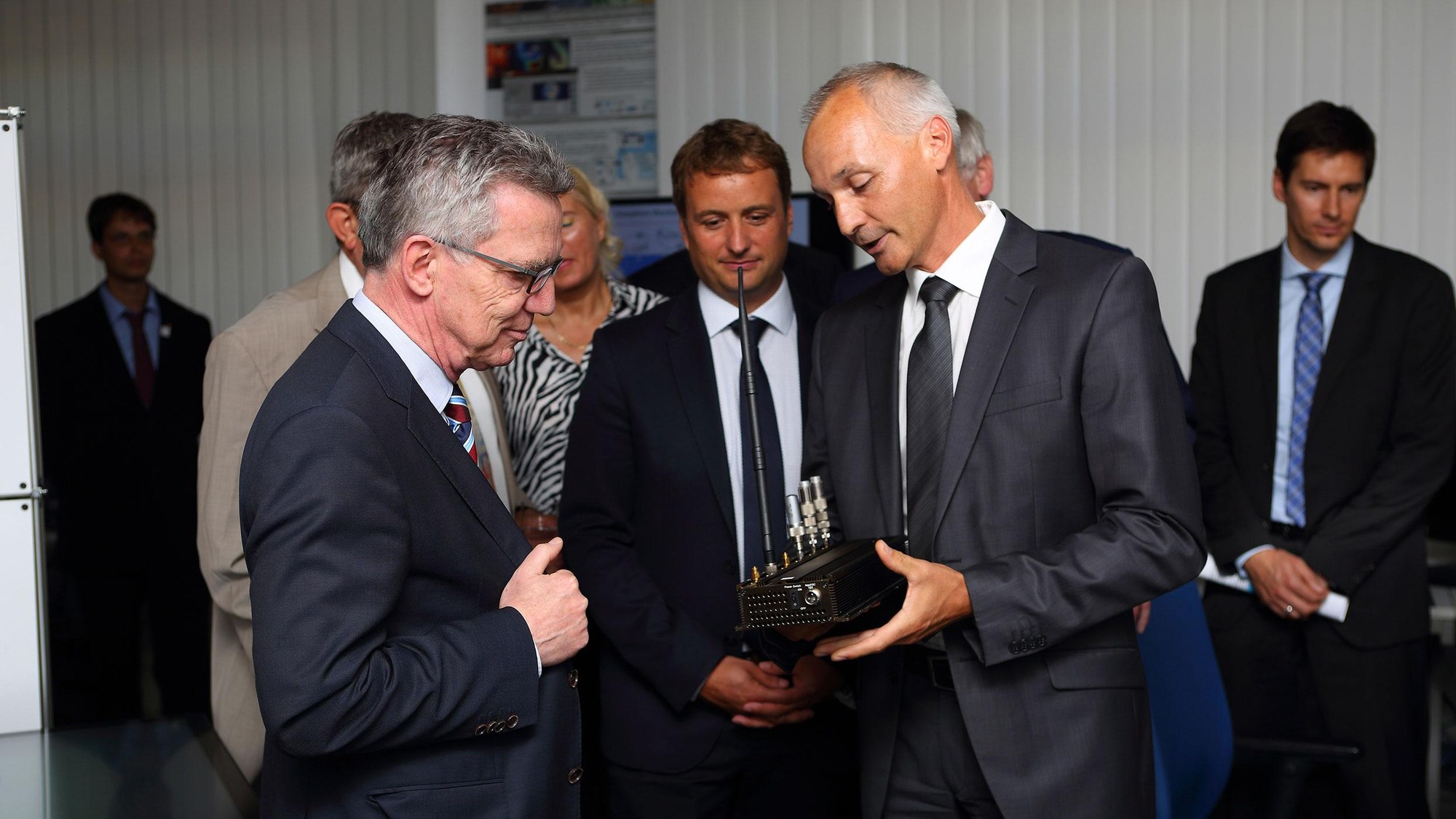 Thoralf Noack stellt Bundesinnenminister Thomas de Maizière die DLR-Forschung zum Thema Maritime Sicherheit in Neustrelitz vor.
