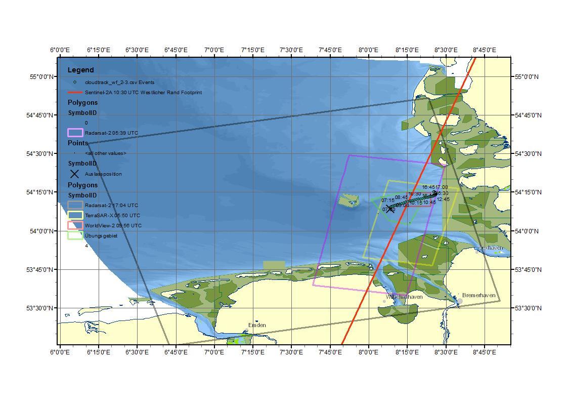 Das Versuchsgebiet mit der vorhergesagten Drift des "Gefahrstoffteppichs" und die zeitlich passende Abdeckung der Region durch Erdbeobachtungssatelliten
