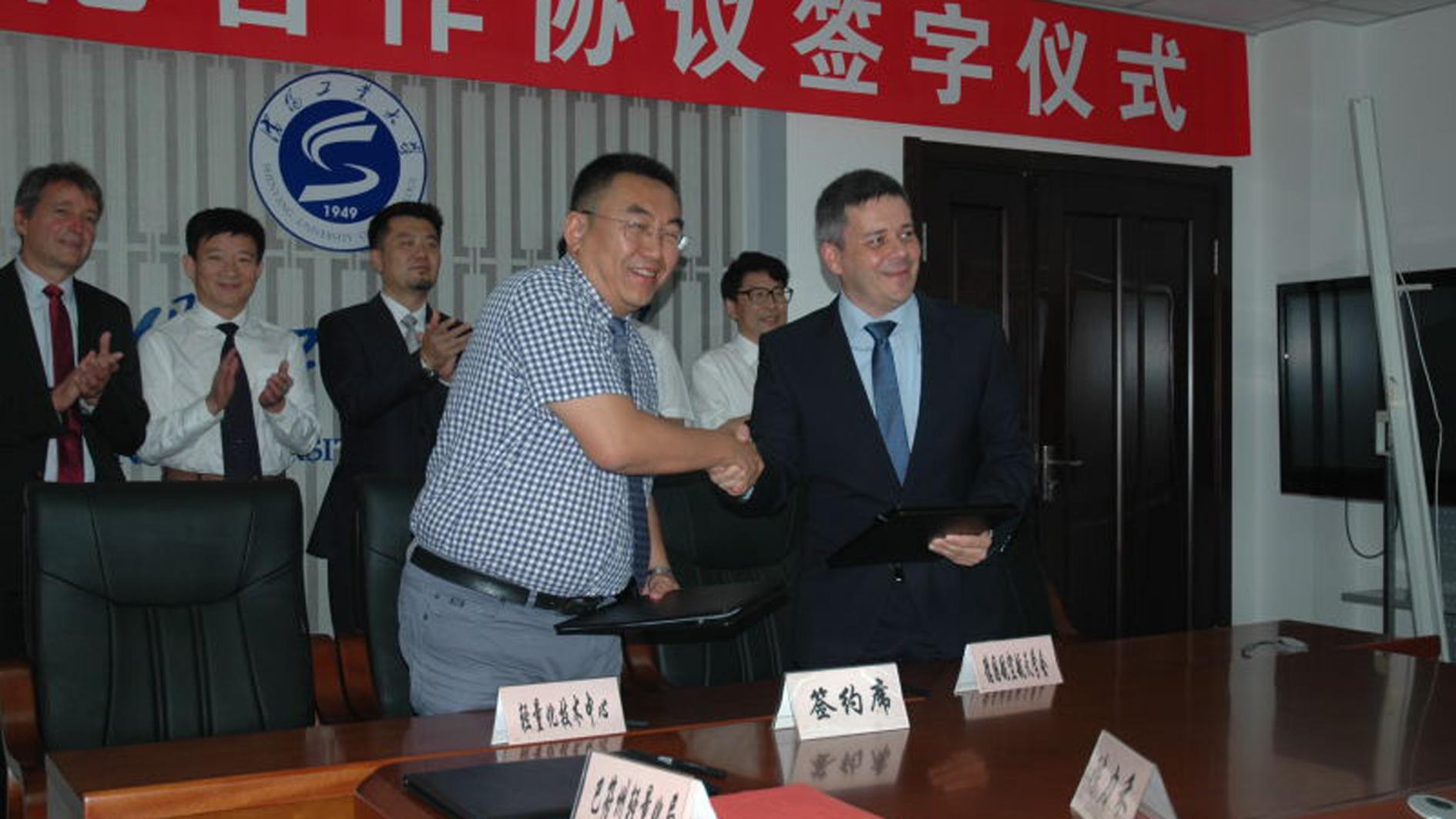 Dr.-Ing. Elmar Beeh vom DLR-Institut für Fahrzeugkonzepte (rechts) und Dr. Lihe Chen, Direktor des Chinesisch-Deutschen Leichtbauzentrums Shenyang (links), unterzeichnen die Kooperationsvereinbarung (im Hintergrund von links nach rechts: Dr. Wolfgang Seeliger (Geschäftsführer der Landesagentur Leichtbau BW), Peng Li (Vice Director of the Shenyang Economic & Information Technology Commission), Hang Li (Chefrepräsentant des Landes Baden-Württemberg in China), Feng Dong (Bürgermeister des Stadtbezirks Tiexi der Stadt Shenyang sowie Direktor des Verwaltungsrats des Sino-German Equipment Manufacturing Industrial Park), Prof. Dr. Mingyi Yan (Vize-Rektor der Shenyang University of Technology).