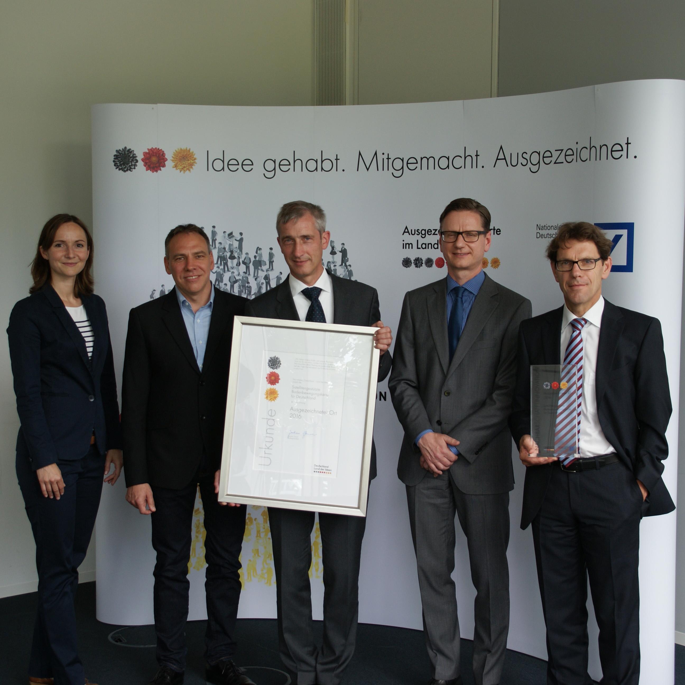 Bei einem Festakt im DLR wurde dem Projektteam die Auszeichnung verliehen. Von links nach rechts: Katrin Roth ("Deutschland – Land der Ideen Management GmbH", Repräsentantin Wettbewerb "Ausgezeichnete Orte"), Nico Adam (DLR EOC-IMF Abt. MF-SAR, Teamleiter SAR-Interferometrie), Dr. Thomas Lege (BGR), Jürgen Zaiser (Deutsche Bank AG) und Prof. Dr. Richard Bamler (Direktor IMF).