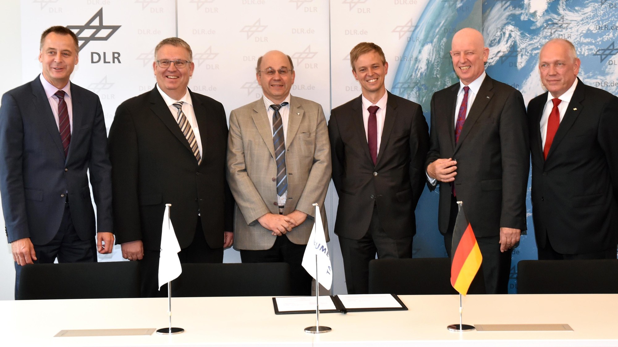 Am 20. September 2016 unterzeichneten das Deutsche Zentrum für Luft- und Raumfahrt (DLR) und Airbus Defence and Space den Vertrag zur Bau- und Designphase des Satelliteninstruments METimage. Zudem bestätigten das DLR und EUMETSAT, die europäische Organisation für die Nutzung meteorologischer Satelliten, ihr Kooperationsabkommen. Bei der Vertragsunterzeichnung zugegen (von links nach rechts): Eckard Settelmeyer, Leiter Erdbeobachtung, Navigation und Wissenschaft Airbus Defence and Space Deutschland, Dr. Michael Menking, Leiter Erdbeobachtung, Navigation und Wissenschaft Airbus Defence and Space, Alain Ratier, Generaldirektor EUMETSAT, Ministerialdirektor Dr. Tobias Miethaner, Abteilungsleiter Digitale Gesellschaft im BMVI, Dr. Gerd Gruppe, DLR-Vorstand für das DLR Raumfahrtmanagement und Andreas Wolke, Leiter Zentrale Aufgaben Raumfahrtmanagement.