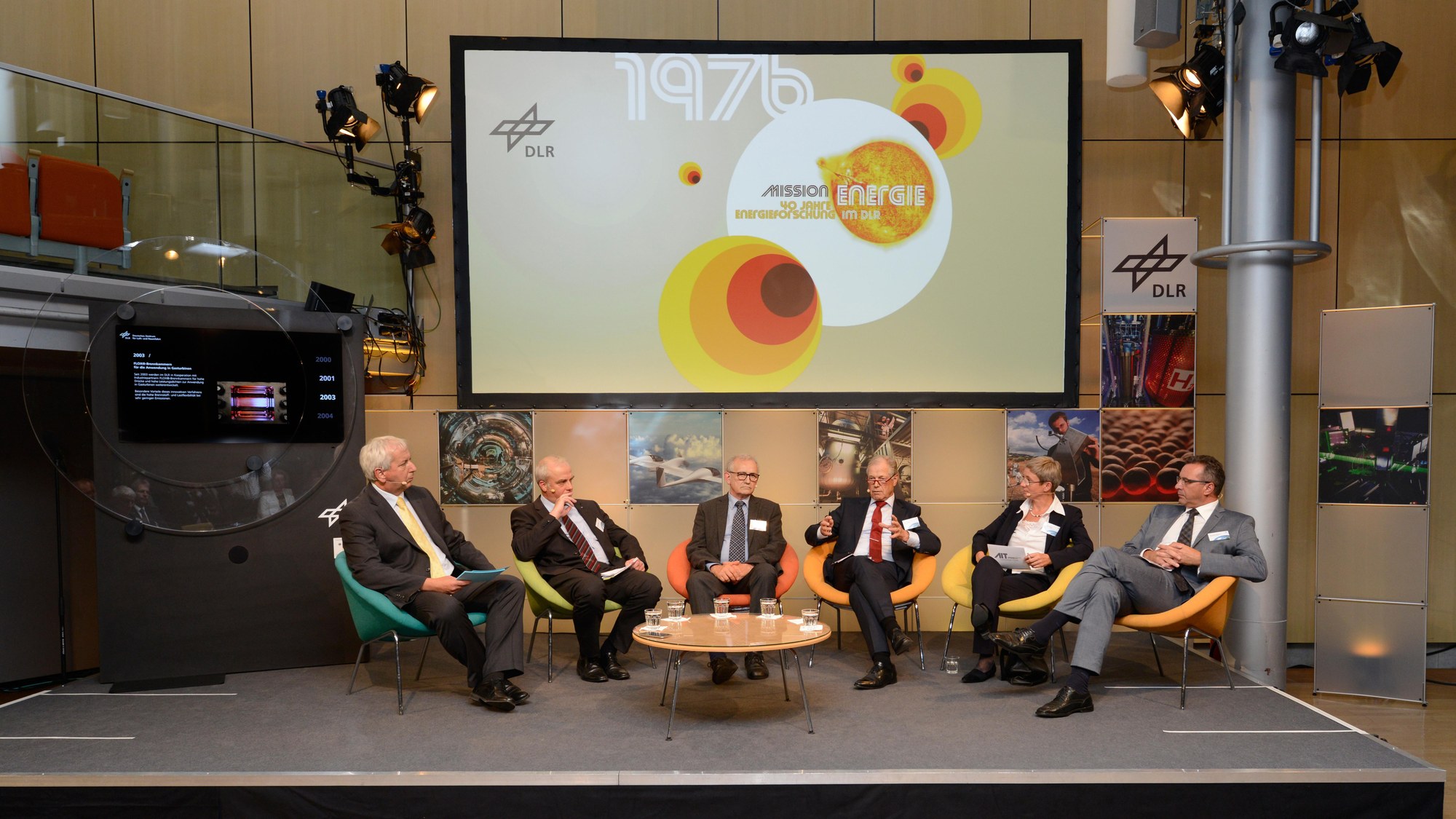 In der Diskussion (vrnl): Dr. Joachim Pfeiffer, Mitglied des Bundestages, Dr. Brigitte Bach, Austrian Institute of Technologie, Prof. Gerd Jäger, RWE AG, Dr. Wolfhart Dürrschmidt, ehemaliger Ministerialrat und Referatsleiter, Bernhard Milow, Programmdirektor Energie beim DLR und Moderator Uli Bobinger