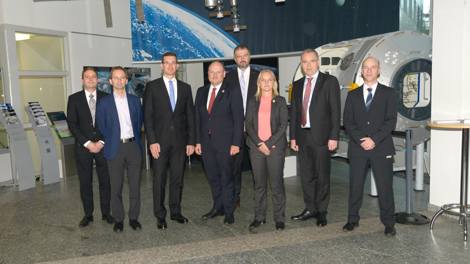 Beim Besuch von Arne Schönbohm (4.v.l.) besuchte die Gruppe auch das German Space Operation Center. Institutsleiter Prof. Felix Huber (2.v.l.) und Dr. Dennis Göge (3.v.l.) erläuterten die IT-Lösungen des Raumflugbetriebs.
