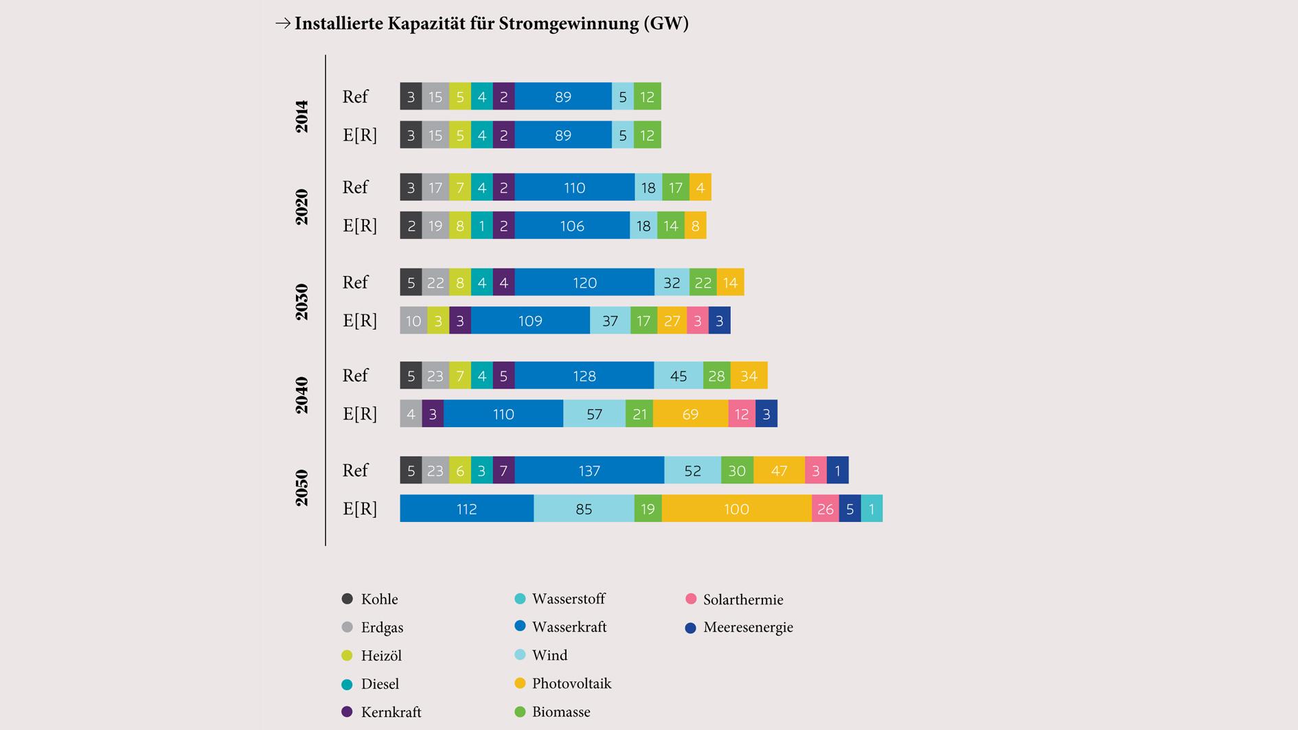 Unterschied zwischen konventionellem Referenzszenario und progressiven Energy [R]Evolution Szenario hinsichtlich den installierten Kapazitäten für die Stromgewinnung in Gigawatt im zeitlichen Verlauf