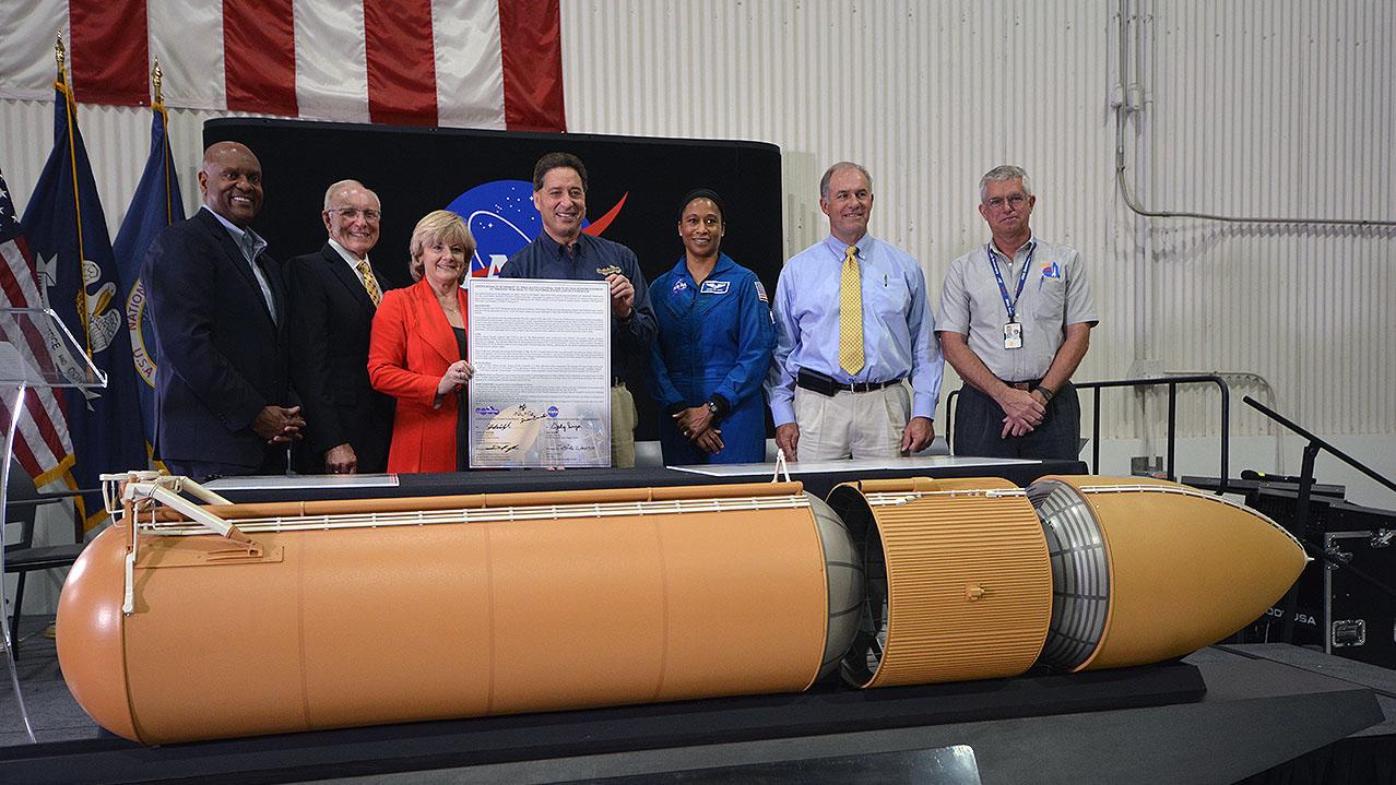Jody Singer (3 v. l.) und weitere NASA- und California Science Center-Mitarbeiter vor einem Modell des Space Shuttle Außentanks
