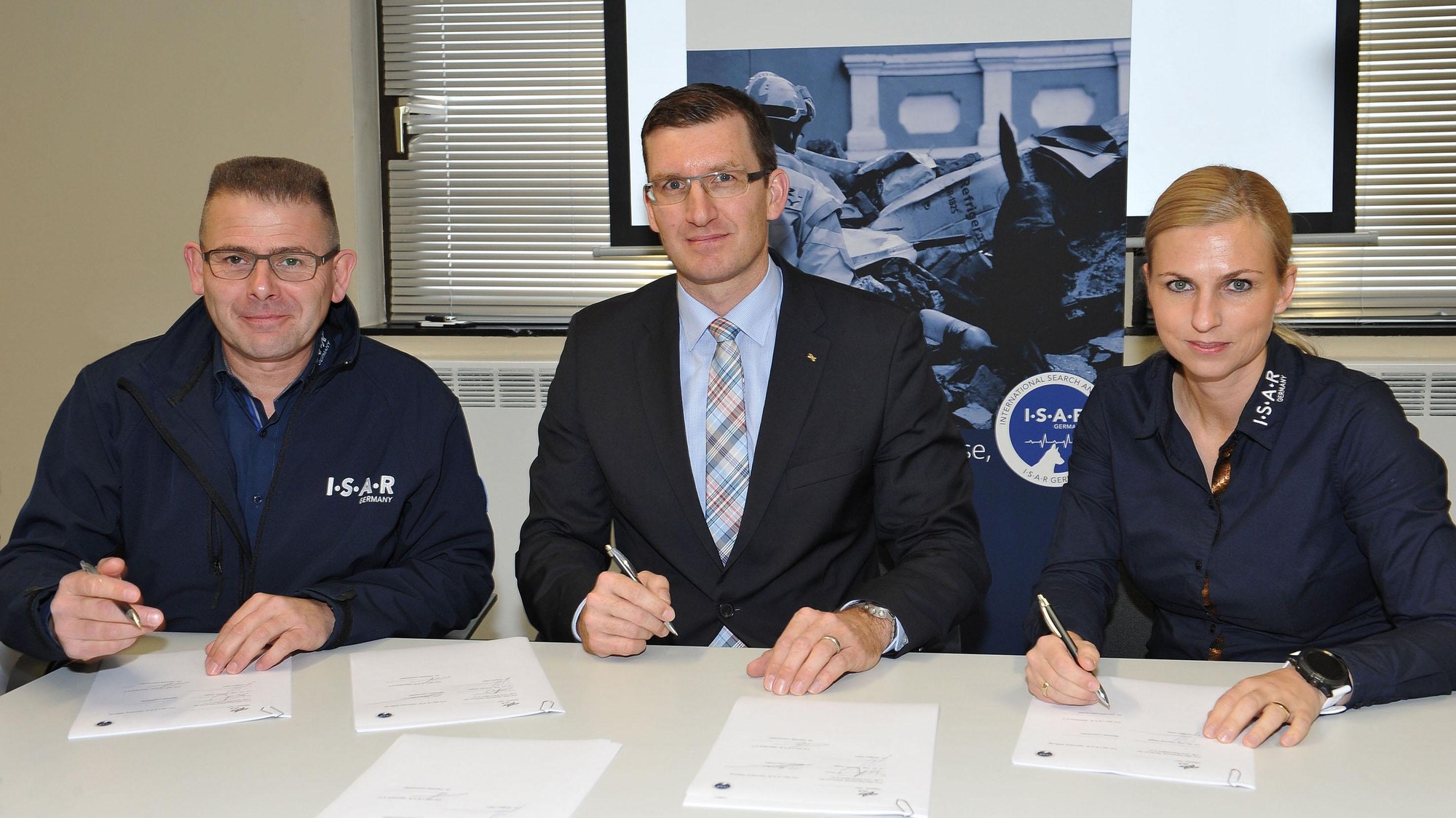 Am 18. November 2016 unterzeichneten Dr. Dennis Göge (mitte), DLR Programmkoordinator Sicherheitsforschung, Daniela Lesmeister, I.S.A.R. Germany Präsidentin und Michael Lesmeister, Geschäftsführer der I.S.A.R. Germany Stiftung, ein Kooperationsabkommen. Die beiden Parteien werden in Zukunft gemeinsam an neuen Entwicklungen und Anwendungen im Bereich des Krisen- und Katastrophenmanagement arbeiten.