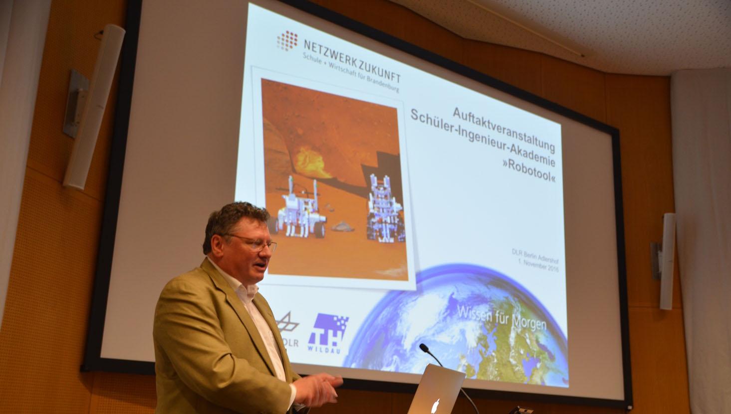 Ulrich Köhler vom DLR-Institut für Planetenforschung stellt den Bezug der Lego-Roboter-Mars-Mission zu aktuellen Mars-Expeditionen des DLR her.
