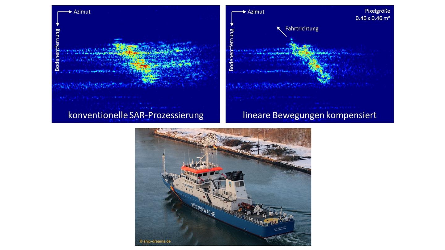 Das Polizeischiff bewegte sich während der Radaraufnahme mit einer Geschwindigkeit von 14,9 Knoten (= 29 km/h). (Oben links: stark verschmiertes Schiff nach konventioneller Radarprozessierung; oben rechts: allererstes Ergebnis mit einem neuen, noch nicht optimierten Prozessierungsalgorithmus; unten: Archivfoto der BP 24 Bad Bramstedt). Der neue Prozessierungsalgorithmus kompensiert die linearen Bewegungskomponenten und liefert so eine schärfere Schiffsabbildung. In einer weiteren Entwicklungsstufe werden auch die Drehbewegungen des Schiffes berücksichtigt, um die Abbildungsqualität weiter zu verbessern.