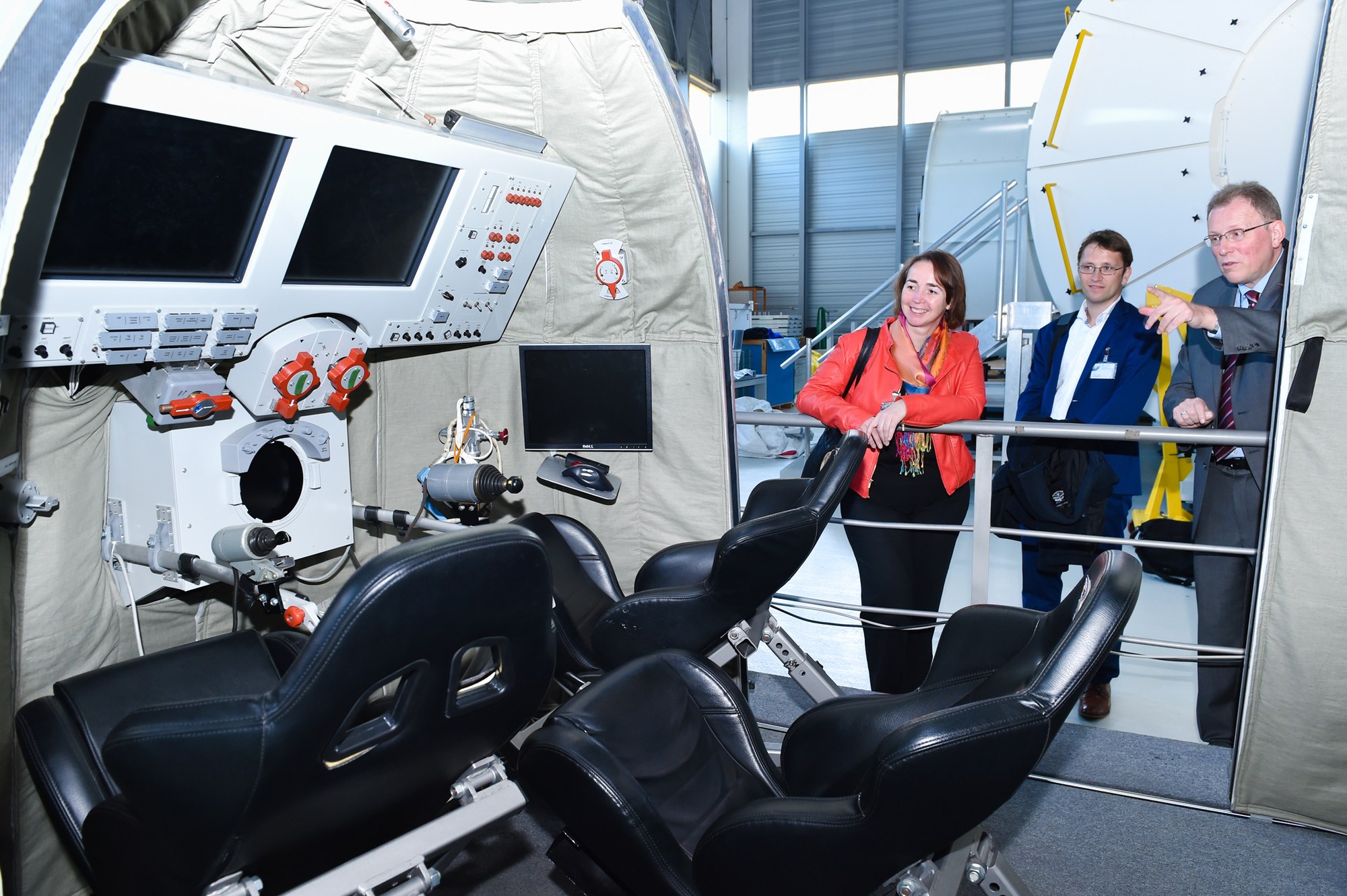 Dr. Andreas Diekmann mit den Gästen vor dem Soyuz-Trainngssimulator.
