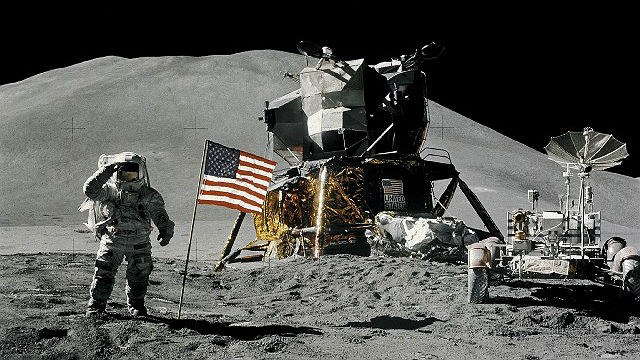 Astronaut James B. Irwin von Apollo 15 salutiert neben der US Flagge und der Mondlandefähre „Falcon“ am Rande der Hadley-Rille. Rechts der so genannte Lunar Rover, das Mondfahrzeug.