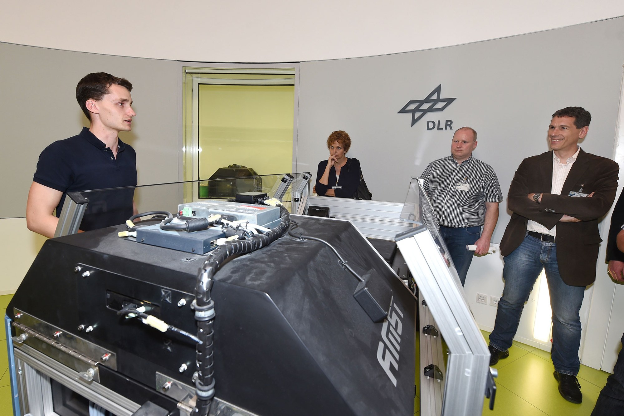Den Gästen wird die Funktionsweise der Kurzarmzentrifuge im :envihab demonstriert.