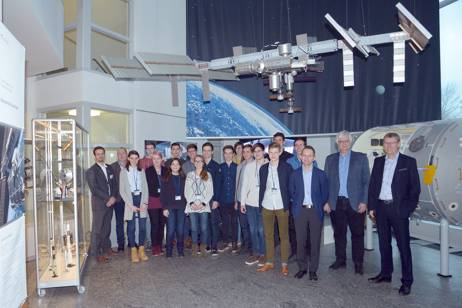 Die Bundessieger von Jugend forscht unter einem Modell der internationalen Raumstation ISS