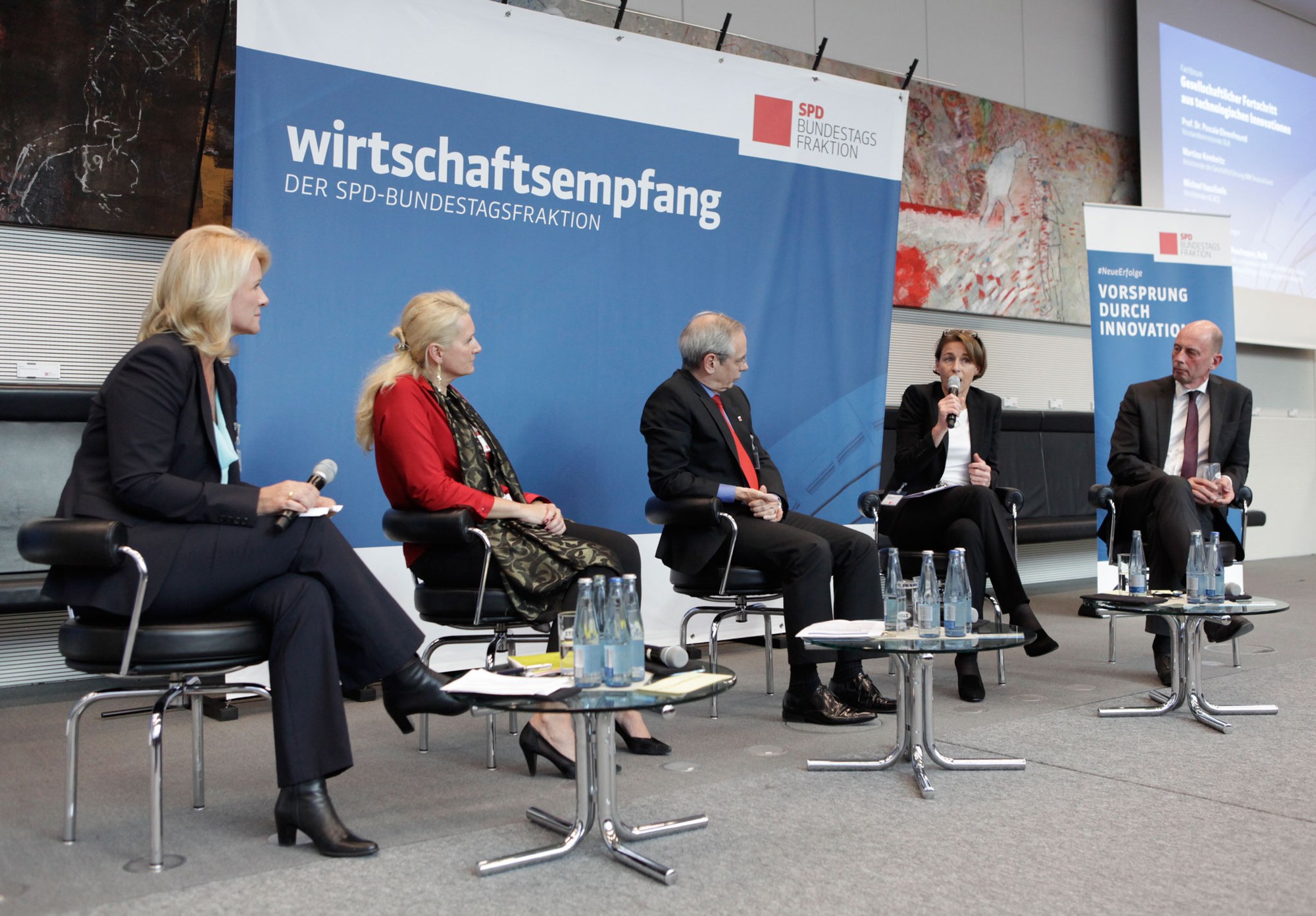 Vorstandsvorsitzende Ehrenfreund diskutiert mit Michael Vassiliadis, Vorsitzender IG BCE, Martina Köderitz, Vorsitzende der Geschäftsführung IBM Deutschland, Wolfgang Tiefensee, Wirtschaftsminister Thüringen und der mittelstandspolitischen Sprecherin Sabine Poschmann MdB über die Rahmenbedingungen für gesellschaftlichen Fortschritt aus technologischen Innovationen auf dem SPD Wirtschaftskongress 2015.