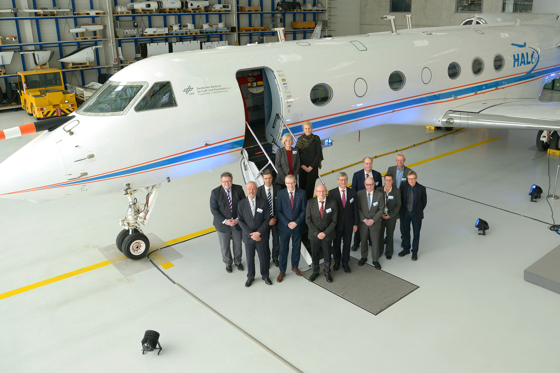 Unten, von links nach rechts: Alex Dorow – Mitglied des Bayerischen Landtags; Dr. Karl-Friedrich Zieghan, Board of Directors, Karlsruher Institut für Technologie; Prof. Markus Rapp, Institutsdirektor Physik der Atmosphäre, DLR; Prof. Rolf Henke, Vorstandsmitglied Luftfahrtforschung, DLR; Prof. Wolfgang Ertmer, Vizepräsident, Deutsche Forschungsgemeinschaft; Prof. Wolfgang Marquardt, Vorstandsvorsitzender, Forschungszentrum Jülich (FJZ); Prof. Martin Stratmann (vorne), Präsident, Max-Planck Gesellschaft; Prof. Andreas Wahner (hinten), Leiter des Wissenschaftlichen Lenkungsausschusses von HALO, FJZ; Katrin Witte, Koordinatorin der HALO-Betreiber, DLR; Prof. Andreas Macke (hinten), Direktor Leibniz-Institut für Troposphärenforschung; Prof. Jos Lelieveld, Institutsdirektor Atmosphärenchemie, Max-Planck-Gesellschaft