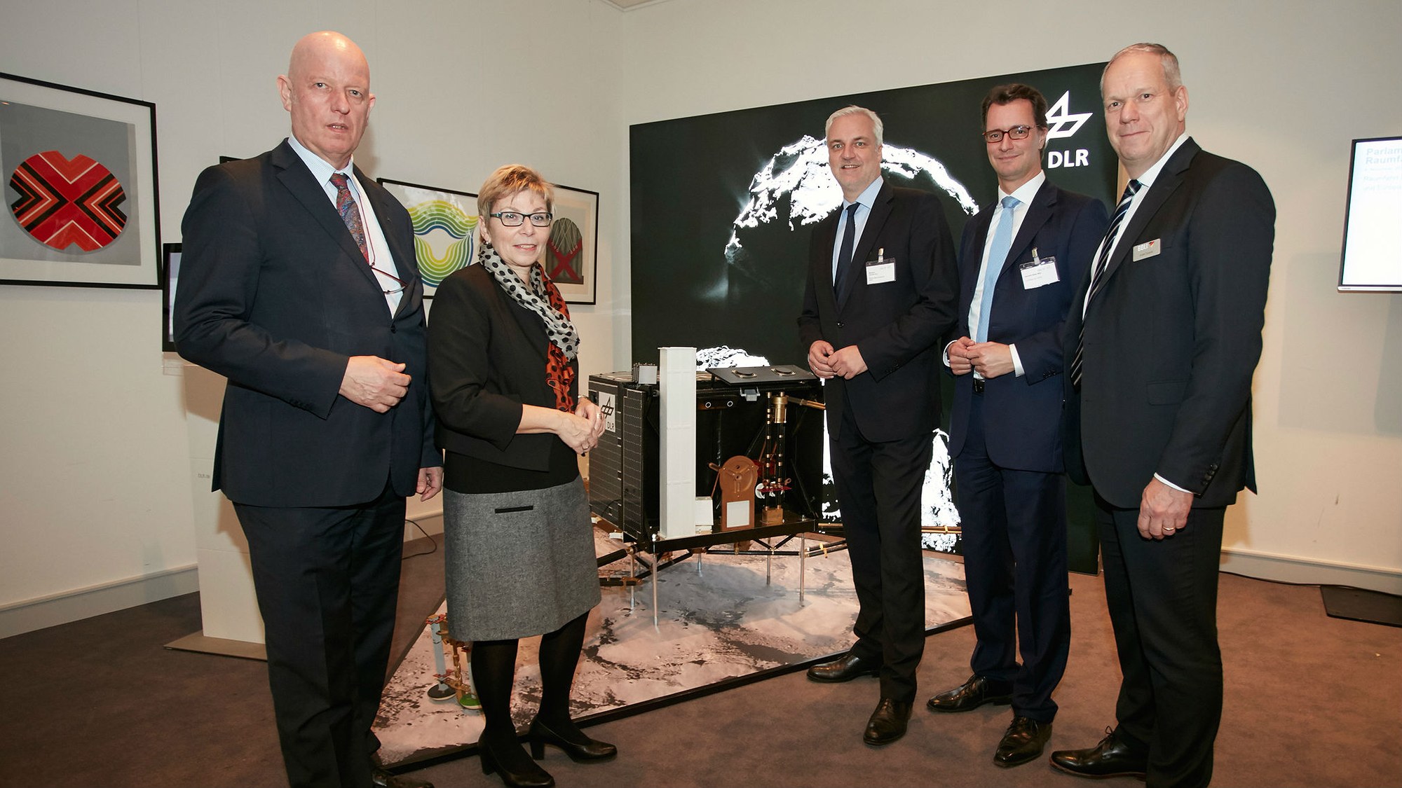 V.l.n.r.: Dr. Gerd-Achim Gruppe, Vorstand des DLR-Raumfahrtmanagements, Landtagspräsidentin Carina Gödecke, MdL, NRW-Wirtschaftsminister Garrelt Duin, Hendrik Wüst, MdL, und Evert Dudok, Vizepräsident des BDLI, vor dem Modell des Philae Landers.