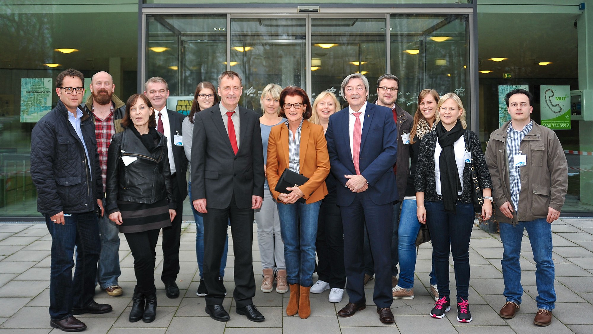Gruppenfoto: Mitte, v.L.n:R.: Klaus Hamacher, stellvertretender Vorstandsvorsitzender des DLR, Regierungspräsidentin Gisela Walsken, Bernhard Fuhrmann, Leiter Politik- und Wirtschaftsbeziehungen des DLR.