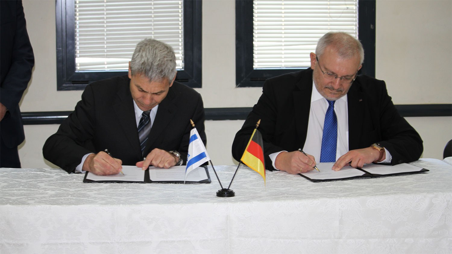 Peretz Vazan, Director General of the Ministry of Science, Technology and Space (l.) und Dr. Hubert Reile , Programmdirektor Raumfahrt beim DLR unterzeichnen die Vereinbarung.