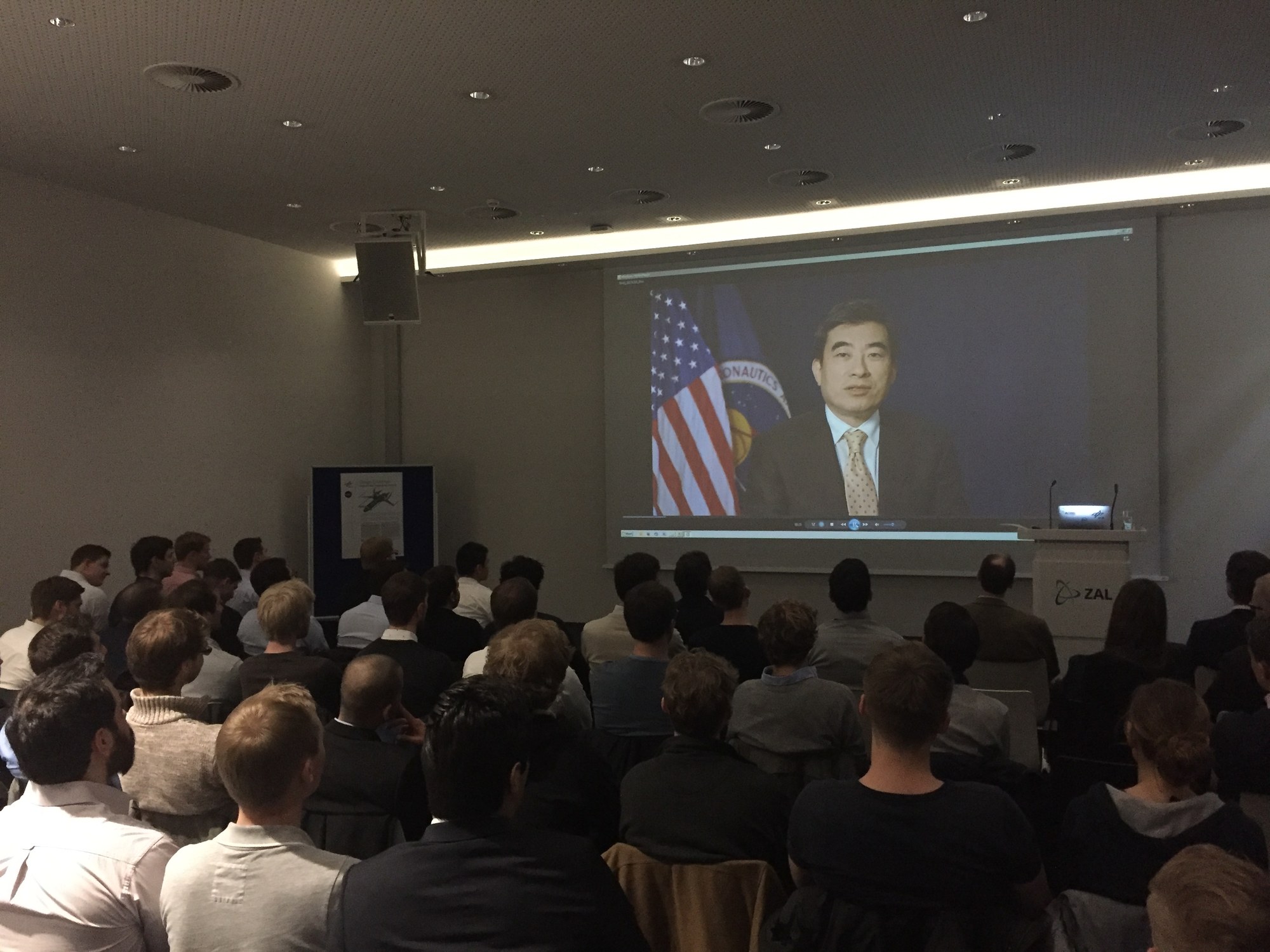 Dr. Jaiwon Shin, NASA-Administrator für den Bereich Luftfahrt, spricht per Videoübertragung zu den Studierenden.