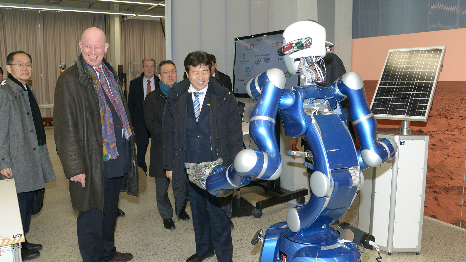 Bei seinem Rundgang über den Standort in Oberpfaffenhofen kam der japanische Minister Tsuruho auch auf Tuchfühlung mit dem humanoiden Roboter Justin. Die Institute präsentierten ihm kurz aktuelle Forschungsprojekte wobei sie den Fokus vor allem auf Projekte legten, die einen unmittelbaren Nutzen für die Gesellschaft haben.