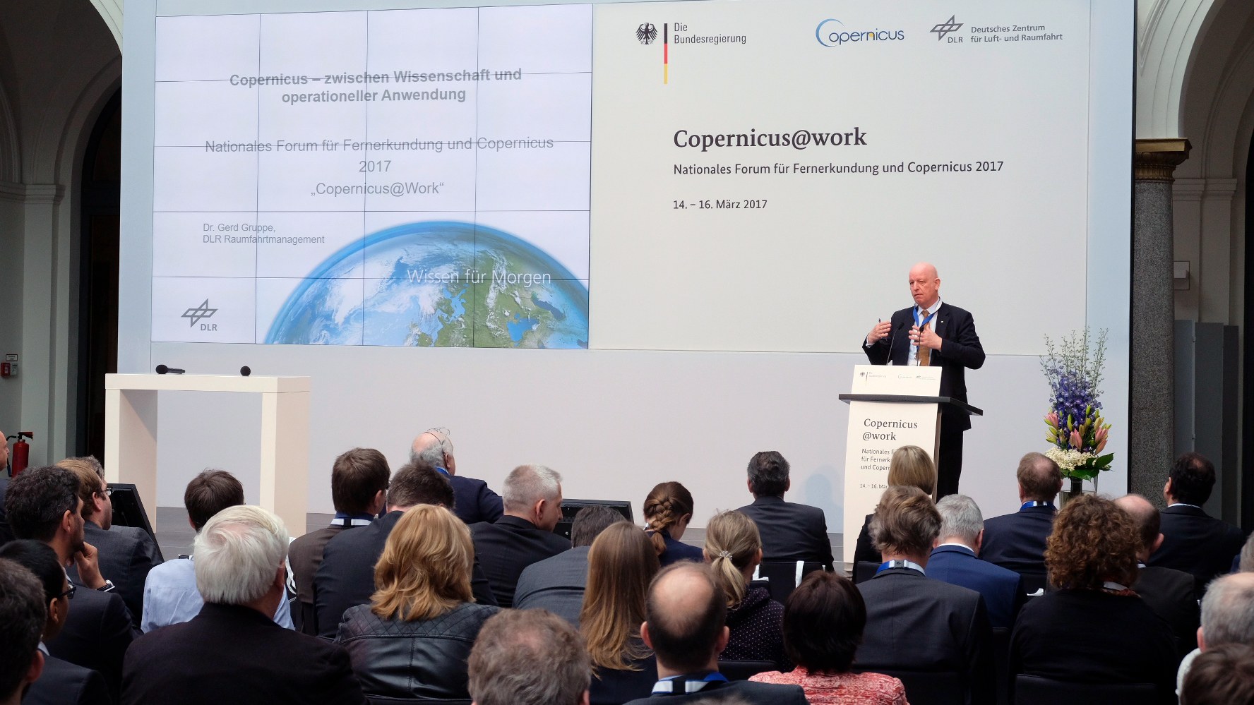 Am 14. März 2017 begann das Nationale Forum für Fernerkundung und Copernicus 2017: „Copernicus@work“ in Berlin. In seinem Leitvortrag thematisierte Dr. Gerd Gruppe, Vorstand für das DLR Raumfahrtmanagement, das Erdbeobachtungsprogramm Copernicus im Spannungsfeld zwischen Wissenschaft und operationeller Anwendung.