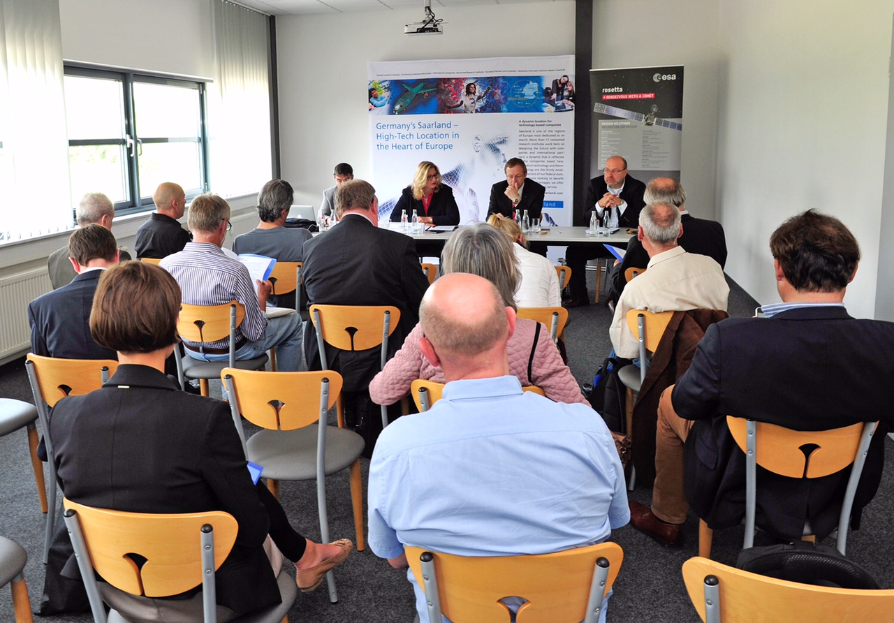 Aufmerksame und diskussionsfreudige Zuhörer bei der Pressekonferenz zum Thema "Innovation Meets Space Business" in Saarbrücken.