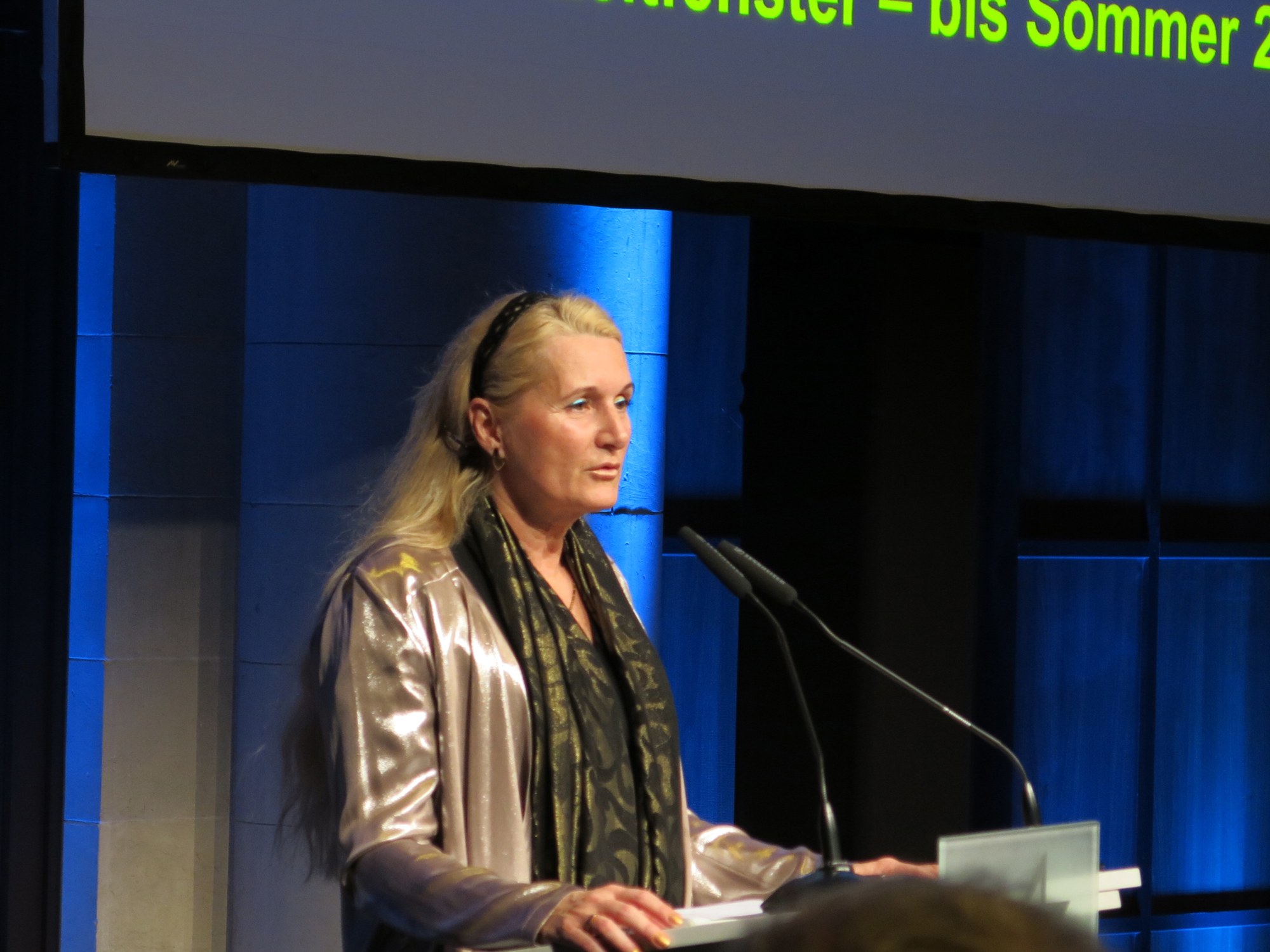 Die Vorstandsvorsitzende des DLR, Prof. Dr. Pascale Ehrenfreund, begrüßt die Gäste auf dem DLR-Neujahrsempfang 2016 in Berlin.