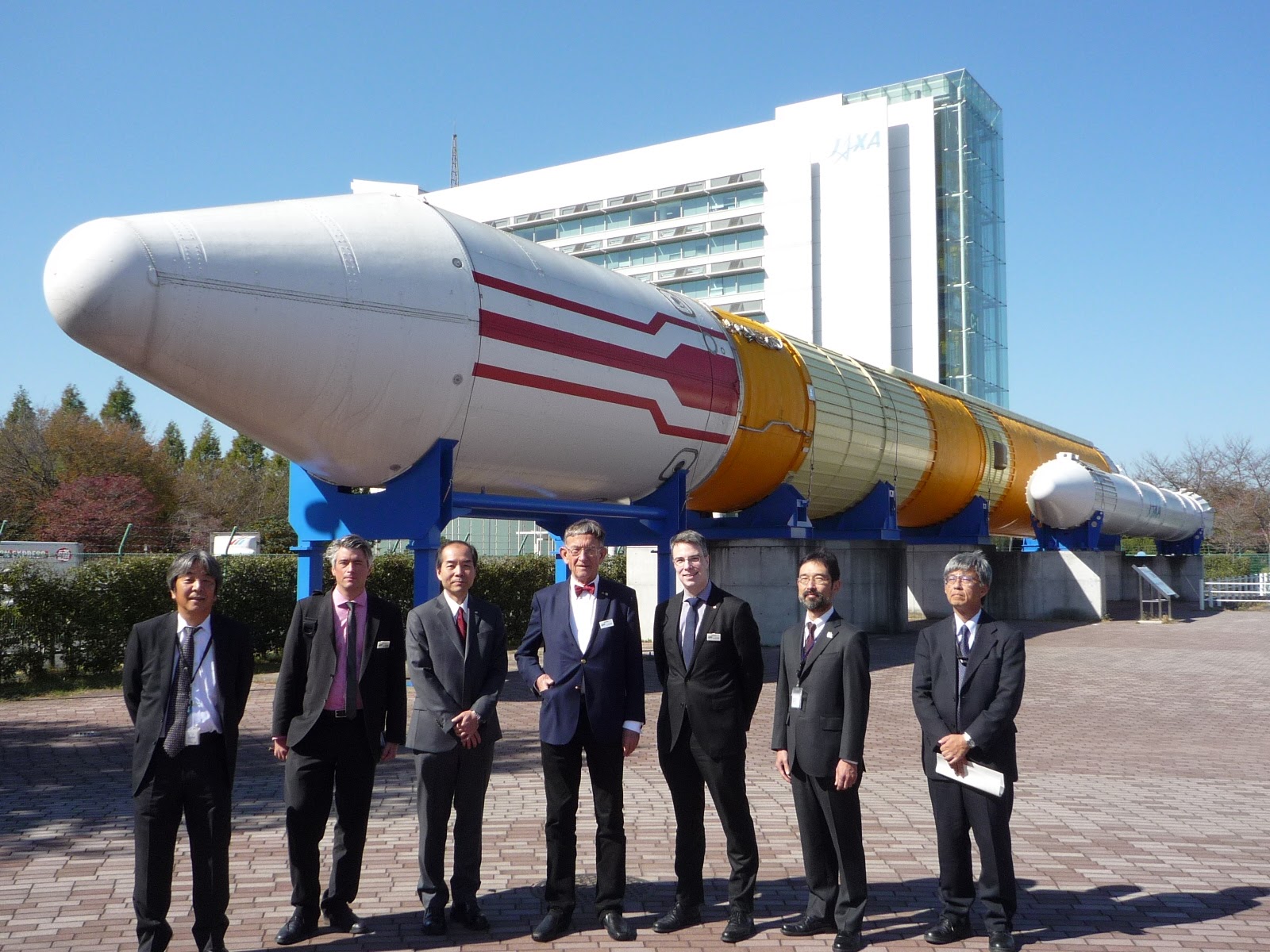 Der Alterspräsident des deutschen Bundestages, Prof. Heinz Riesenhuber, hatte während seines Besuchs auch die Gelegenheit, sich über die japanischen Trägerraketen zu informieren. Auf dem Bild ist die H-II, Vorgänger der aktuell benutzten H-IIA.