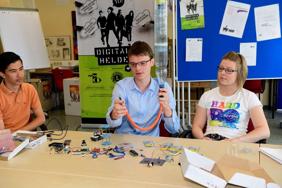 Schüler Tobias Laßmann stellt zusammen mit seinen Kollegen Christina Völker und Le Du Lischetzke die Technik ihres Satelliten vor.