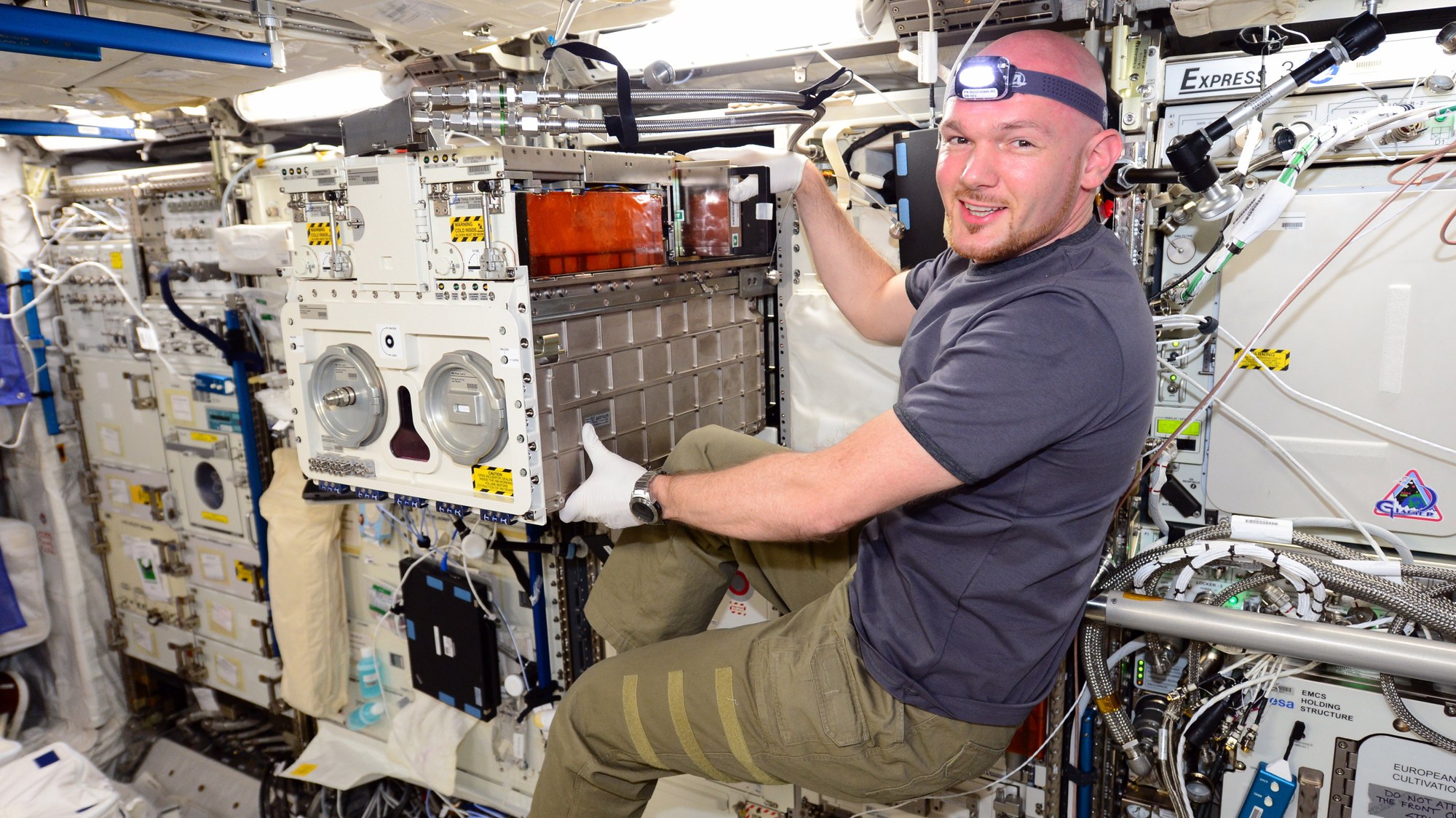 Bei seiner zweiten Mission auf der Internationalen Raumstation ISS im Jahr 2018 wird der deutsche ESA-Astronaut Alexander Gerst die drei Experimente der Gewinner des Studentenwettbewerbs "Überflieger" betreuen. Das Foto stammt von der Blue-Dot-Mission, bei der Gerst unter anderem Experimente an der Biolab-Anlage durchführte.