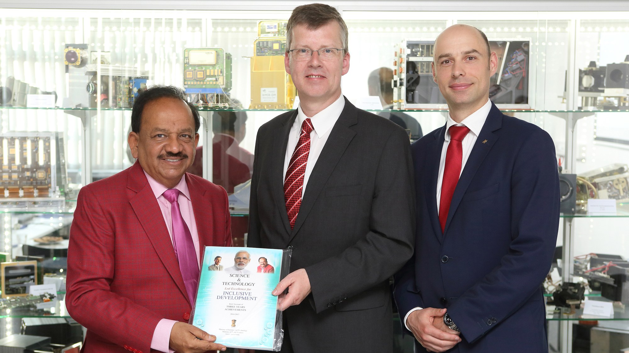 (Von links nach rechts: Indischer Minister Dr. Harsh Vardhan, Leiter des DLR-Instituts für Optische Sensorsysteme Prof. Dr. Heinz-Wilhelm Hübers und Nicolas Peter, Leiter der Abteilung Strategie und Internationale Beziehungen im DLR.)