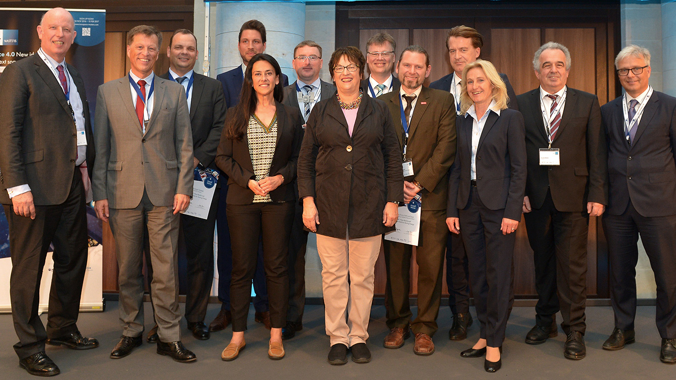 In den drei Kategorien des zweiten INNOspace Masters Wettbewerbs haben das Projekt "Wall#E" vom Institut für Raumfahrtsysteme der TU Braunschweig als Gesamtsieger und Gewinner der DLR Raumfahrtmanagement-Challenge, das Projekt "MSP" vom Zentrum für Telematik e.V. in Würzburg als Sieger der Airbus Defence and Space-Challenge und das Projekt "Bake in Space" der Bake in Space GmbH aus Bremen in der Kategorie "ESA BIC Startup-Challenge" gewonnen. Überreicht wurden die Preise von der Bundeswirtschaftsministerin und Beauftragten der Bundesregierung für die Luft- und Raumfahrt, Brigitte Zypries (von links): Dr. Gerd Gruppe, Vorstand DLR Raumfahrtmanagement, Dr. Johannes von Thadden, Airbus Defence and Space, Henning Wichmann, INVENT GmbH, Linus Froböse, TU Braunschweig, Grazia Vittadini, Airbus Defence and Space, Stefan Linke INVENT GmbH, Brigitte Zypries, Bundesministerin für Wirtschaft und Energie, Dr. Frank Zimmermann, cesah GmbH, Prof. Dr.-Ing Enrico Stoll, TU Braunschweig, Thorsten Rudolph, AZO, Dr. Franziska Zeitler Organisatorin des Wettbewerbs im DLR Raumfahrtmanagement, Dr. Fritz Merkle, OHB SE und Ulrich Kübler, Airbus Defence and Space.