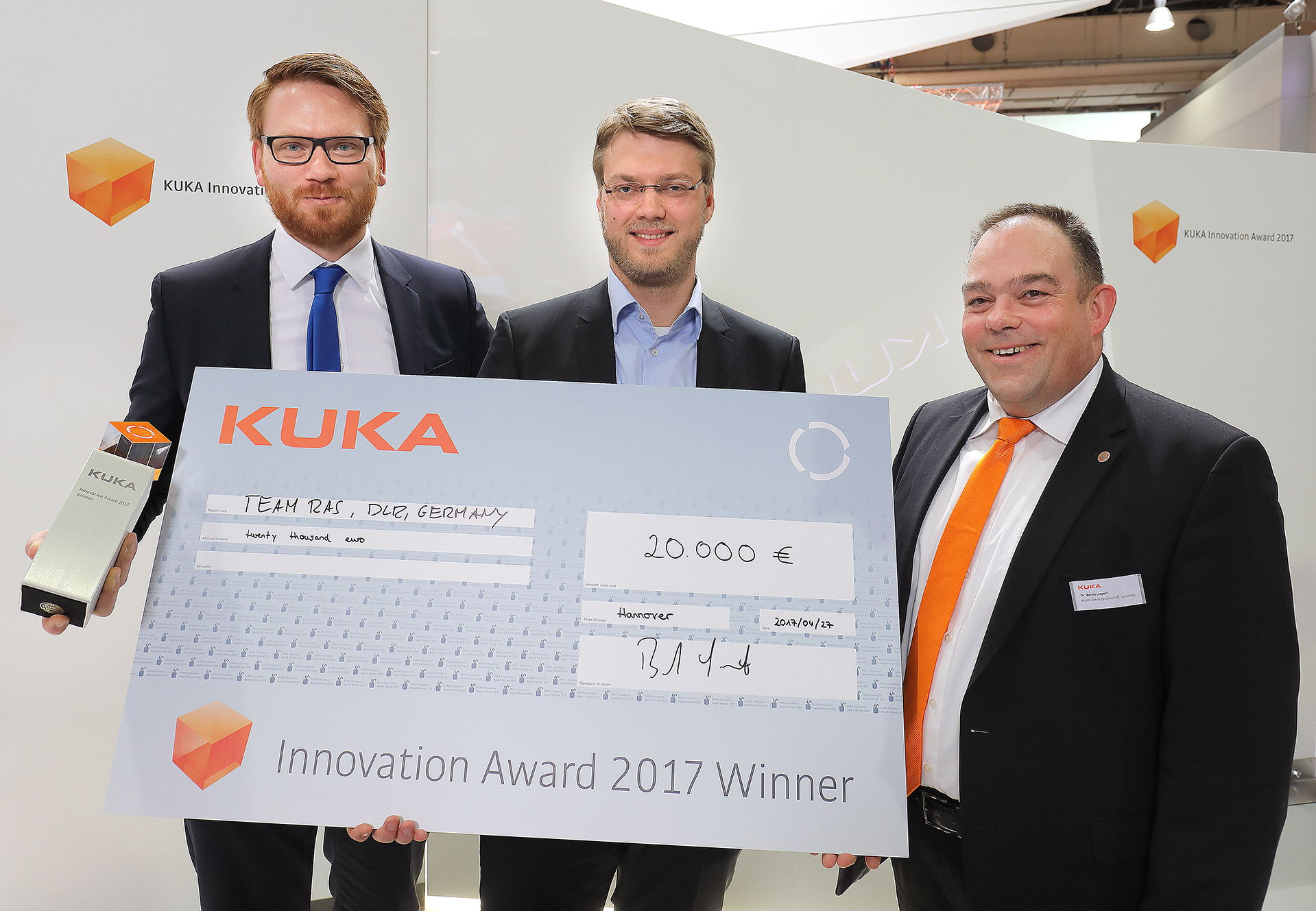 Dr.-Ing. Hannes Höppner (links) und Roman Weitschat (rechts) vom DLR-Institut für Robotik und Mechatronik wurden für die Entwicklung des "End effector"-Airbag mit dem KUKA Innovation Award 2017 ausgezeichnet. Die Preisverleihung fand am 27. April 2017 auf der Hannover Messe statt.