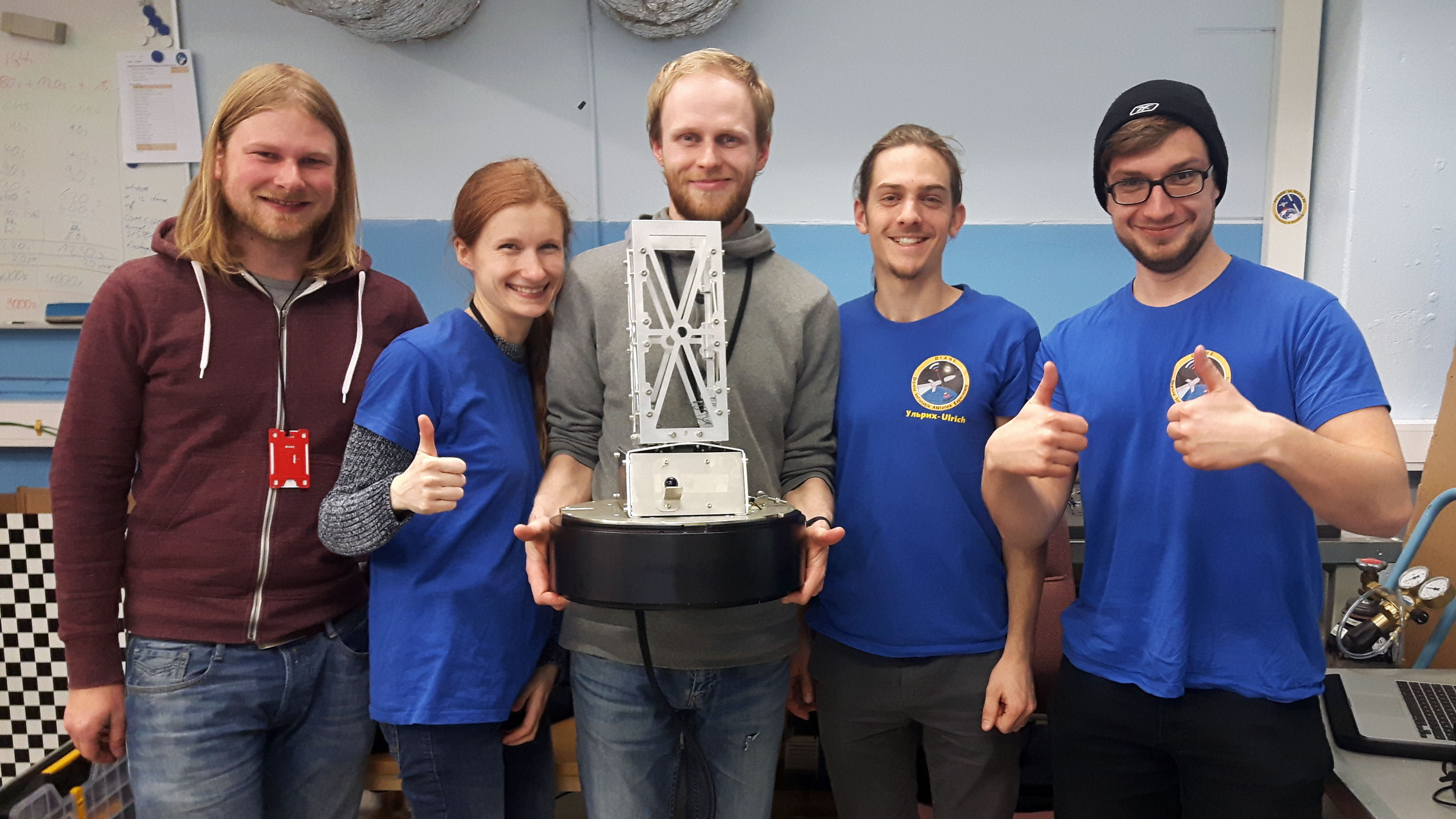 Das Studententeam der Technischen Universität Dresden präsentiert sein Experiment DIANE, das erfolgreich aus dem Weltraum zurückgekehrt ist. Das Team testete eine rund sieben Meter lange, stabförmige Antenne, die sich während des Flugs in Schwerelosigkeit entfaltet hat.