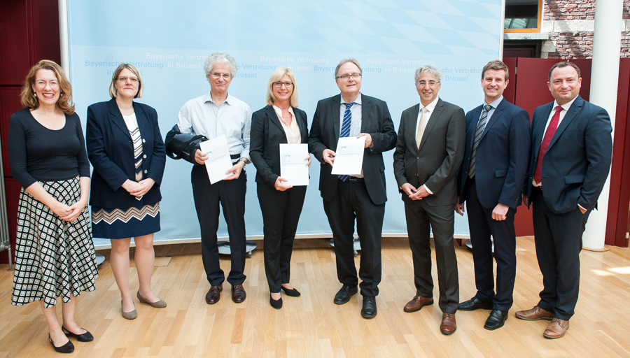 Die Strategie des "Virtuellen Alpenobservatoriums" (VAO) wurde am 29. Juni 2017 in Brüssel von Prof. Dr. Michael Bittner (3. von rechts) vom Deutschen Fernerkundungsdatenzentrum des DLR vorgestellt, in seiner Funktion als Vorsitzender des VAO-Lenkungsausschusses. In der Bayerischen Landesvertretung bei der Europäischen Union überreichte Prof. Bittner anschließend jeweils ein Exemplar der VAO-Strategie an Ulrike Scharf (Bildmitte), Bayerische Staatsministerin für Umwelt und Verbraucherschutz, an Dr. Andrea Tilche (links), Generaldirektor für Forschung und Innovation der Europäischen Kommission, und an Dr. Jiří Buriánek (rechts), Generalsekretär des Europäischen Ausschusses der Regionen.