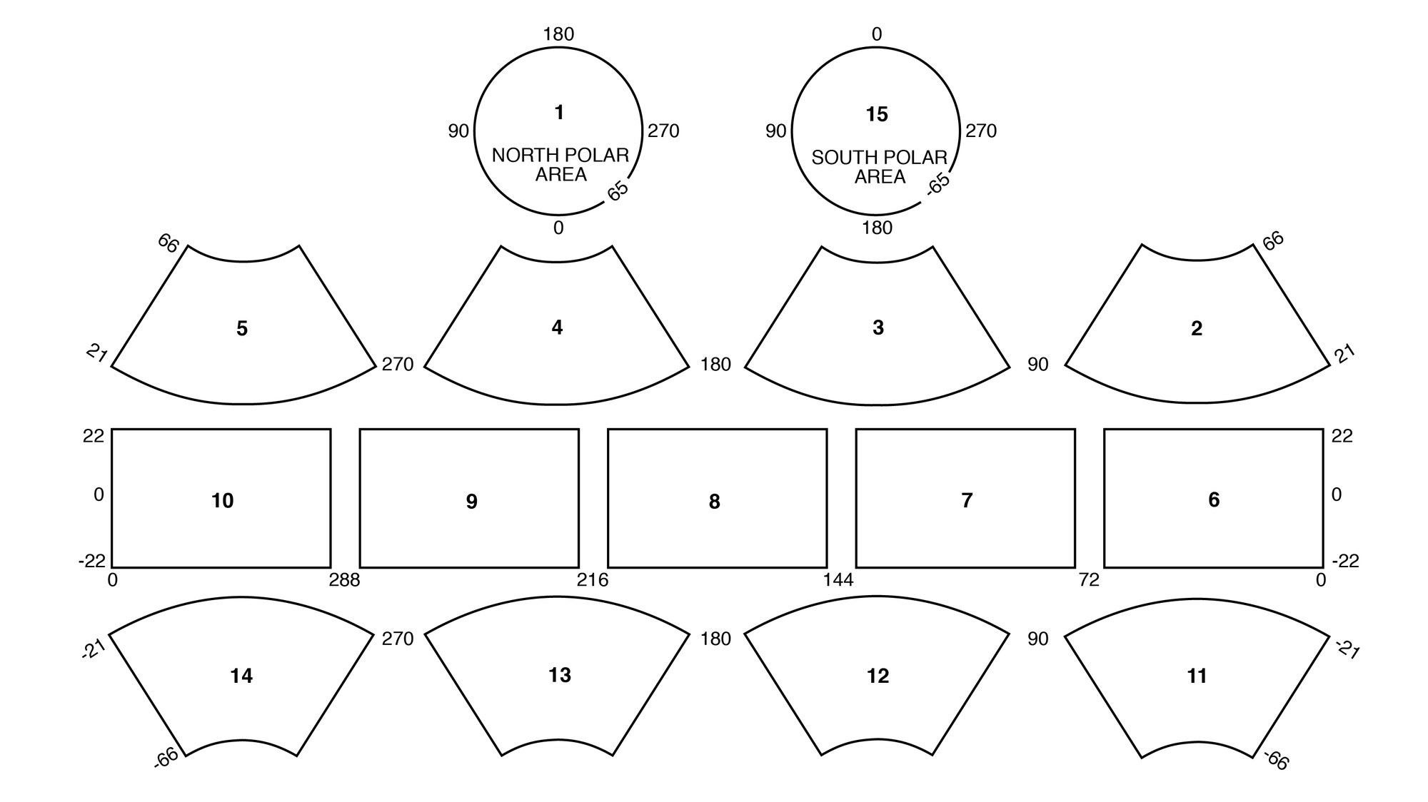 Nach einem Standardwerk zweier US-amerikanischer Wissenschaftler, die Ende der achtziger Jahre genau festgelegt haben, wie solche planetaren Atlasschnitte aussehen sollen, wird das Blattschema für die Kartierung der Eismonde festgelegt. Für die Trabanten des Saturn erwiesen sich drei verschiedene Blattschnitte als geeignet: Enceladus, Tethys, Dione und Rhea sind, wie in diesem Beispiel, auf jeweils 15 Karten dargestellt. Mimas und Iapetus auf drei Kartenblättern und lediglich Phoebe besteht aus nur einer Karte, da er von den genannten Monden am weitesten vom Saturn entfernt ist und Cassini nur einmal zu Beginn der Mission an ihm vorbeigeflogen ist.