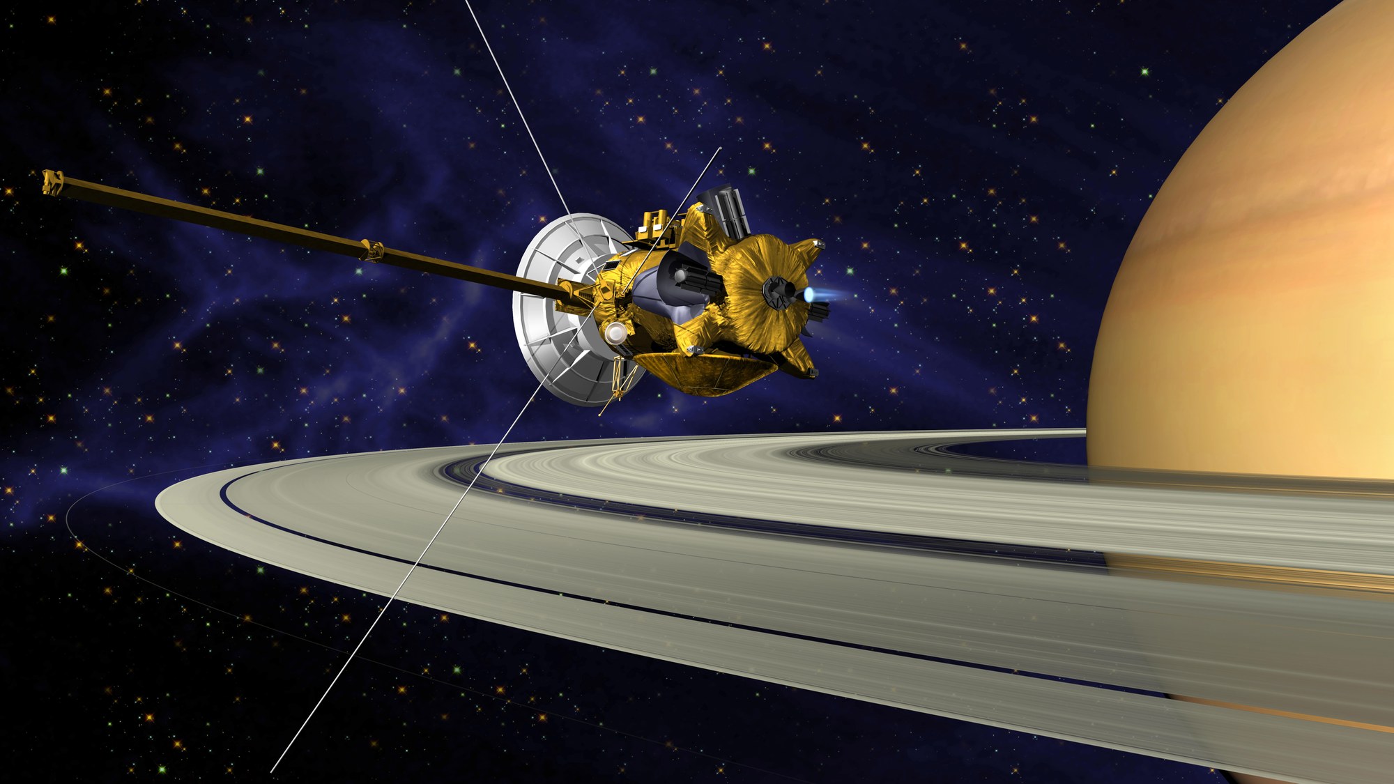 Am 30. Juni 2004 wurde die Raumsonde Cassini gemeinsam mit ihrer Tochtersonde Huygens in eine Saturnumlaufbahn gelenkt. Zunächst bremsten die Triebwerke 90 Minuten lang die Raumsonde ab, anschließend wurde sie um 180 Grad gedreht, so dass sie mit der großen Viermeter-Antenne nach vorn durch die Ebene der Ringe flog, um auf diese Weise die empfindliche Bordelektronik vor dem Einschlag winziger Staubpartikel zu schützen.