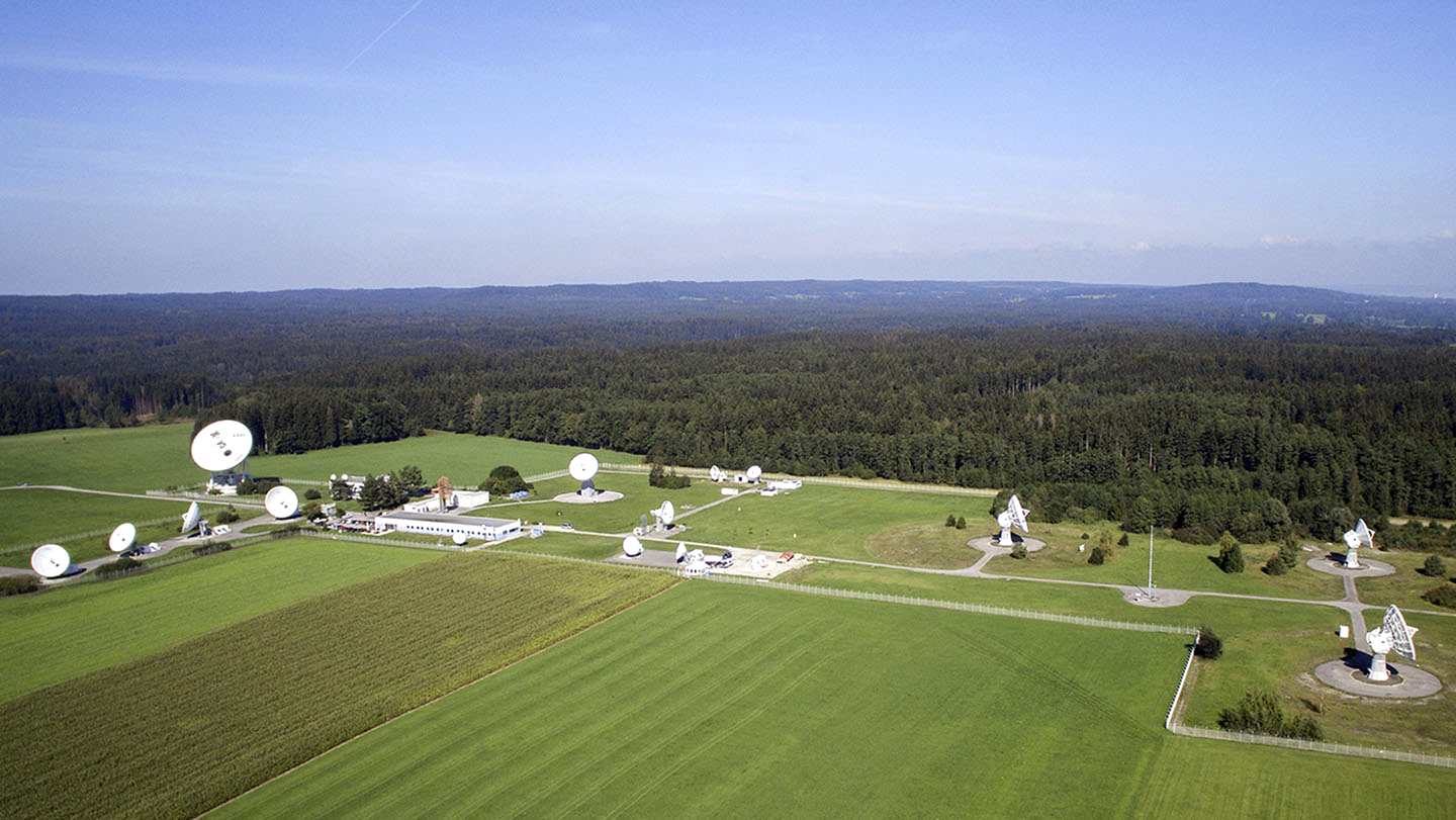 Luftaufnahme des DLR-Standorts Weilheim: Mit Hilfe der Antennen wird während eines Satellitenüberflugs die Kommunikationsverbindung zwischen Satellit und Kontrollzentrum hergestellt. Sie ermöglichen den gleichzeitigen Datenverkehr in beide Richtungen.