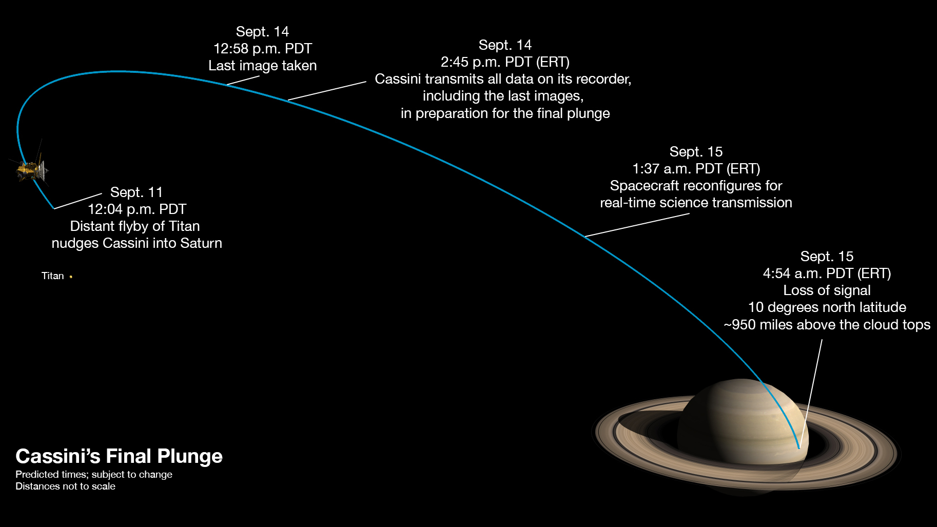 Überblick über die letzten Meilensteine bis zum finalen Eintauchen der Cassini-Raumsonde in die Saturnatmosphäre.