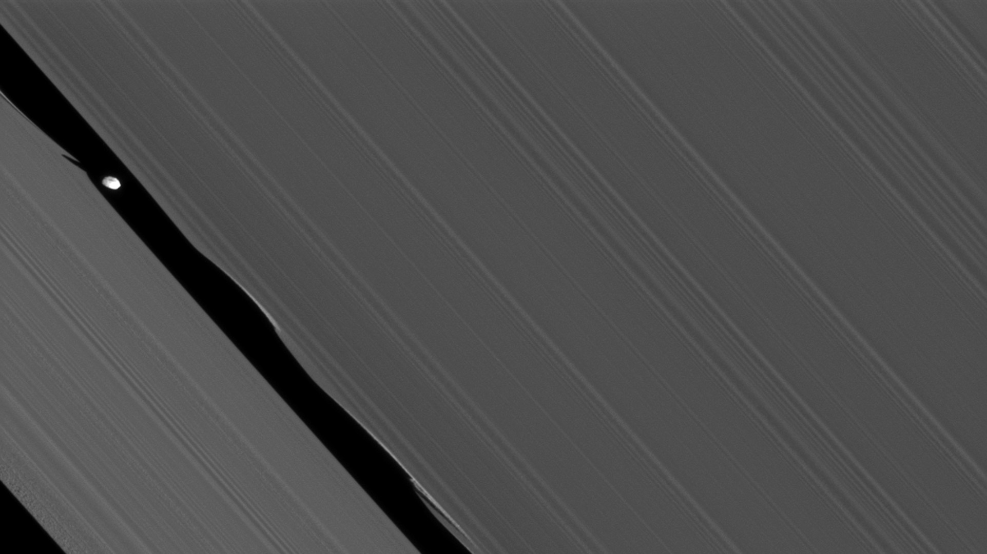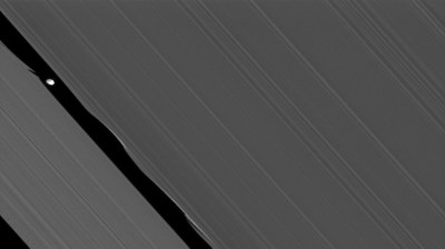 Daphnis war "die" Entdeckung Cassinis in den Ringen. Der kaum zehn Kilometer große Mond sorgt mit seiner Schwerkraft wie ein Schneepflug dafür, dass die Keeler-Lücke in den A-Ringen des Saturn offen bleibt. Wegen dieser Funktion werden Monde wie Daphne oder Atlas und Pan als Schafhirtmonde bezeichnet. Seine Bahn ist gegenüber der Ringebene ein klein wenig geneigt, was vermutlich die Ursache für die Verwirbelungen an den Rändern der Keeler-Lücke ist. Material am Innenrand der Keeler-Lücke umkreist den Saturn schneller als am Außenrand, deswegen erzeugt Daphnis eine Bug- und eine Heckwelle. Die Aufnahme wurde am 5. Juli 2010 aus 75.000 Kilometern Entfernung aufgenommen und zeigt Details bis 450 Meter Größe.