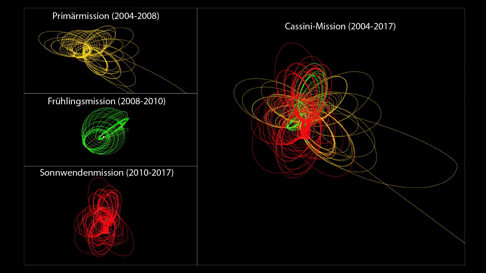 Zwischen 2004 und 2017 umrundete die Cassini-Sonde insgesamt 294 Mal den Ringplaneten - in unterschiedlichen Entfernungen und Inklinationen (Neigungswinkeln gegenüber der Ebene der Ringe bzw. dem Saturnäquator). Die Mission teilte sich in drei Hauptphasen: eine Primärmission, eine Frühlingsmission und eine Sonnenwendmission. Im April 2017 wurde dann das Ende der Mission eingeläutet und das „Grand Finale“ begann, das mit dem Sturz der Sonde in die Saturnatmosphäre am 15. September 2017 enden wird. Immer wieder diente Titan, der größte Saturnmond, als "Schwerkraftanker" für die Änderungen des Orbits.
