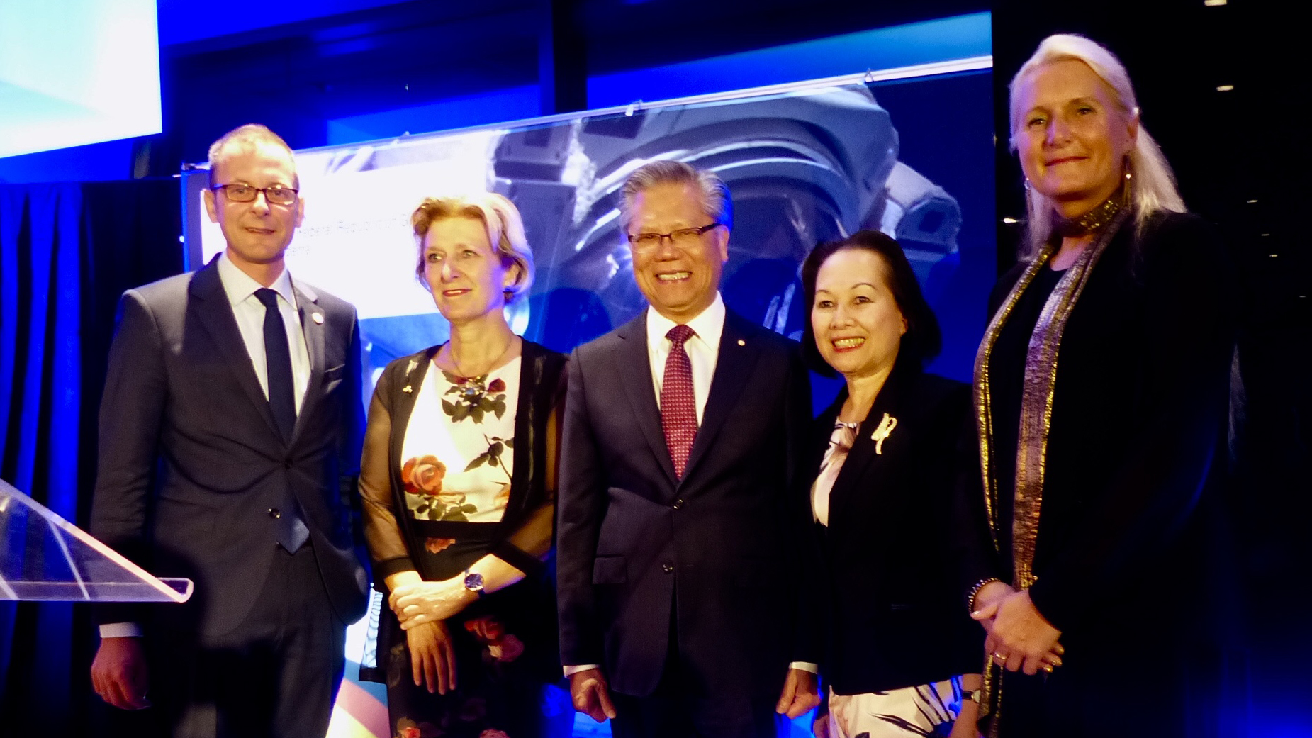 Zum traditionellen "Deutschen Abend" des diesjährigen IAC begrüßte DLR-Vorstandsvorsitzende Prof. Pascale Ehrenfreund (r.) unter anderem Senator Martin Günthner aus Bremen, die deutsche Botschafterin in Australien, Anna Prinz, der Gouverneur von Süd-Australien Hieu Van Le mit seiner Frau Lan Le (v.l.n.r.).