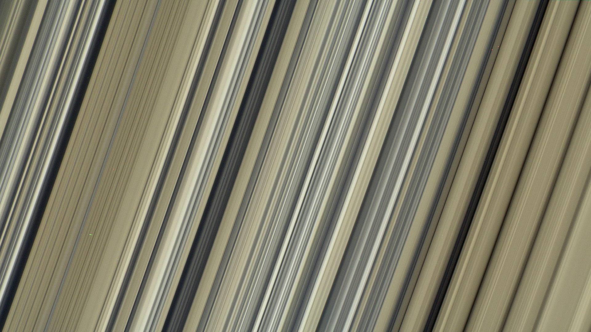 Am 6. Juli 2017 fotografierte Cassini einen 7000 Kilometer breiten Abschnitt in der Mitte des B-Rings aus nur 76.000 Kilometern Entfernung in Echtfarben. Zwar weiß man, dass die Ringe aus Eis- und Staubpartikeln, zum Teil auch hausgroßen Brocken und auch einigen kleinen Monden bestehen, ein Rätsel ist aber immer noch, welche Substanzen für die individuellen Farben verantwortlich sind. Durch die Bahnänderung im Zuge des Grand Finale-Orbits waren solche Aufnahmen, die feinste Strukturen bis zu einer Bildauflösung von drei Kilometern per Pixel erkennen lassen, zum Ende der Mission möglich. Die schmaleren Ringe in der Bildmitte sind etwa 40 Kilometer breit, die breiteren Ringe am rechten Bildrand etwa 300 bis 500 Kilometer