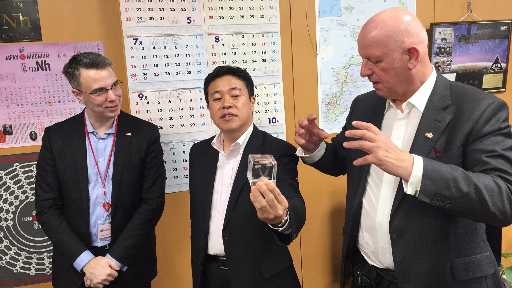 Dr. Gerd Gruppe (rechts) traf Yosuke Tsuruho, den japanischen Minister für Raumfahrtpolitik (Mitte), im Cabinet Office und erklärte die deutsche Satellitenmission TanDEM-X anhand eines Modells im Beisein von Dr. Niklas Reinke, Leiter des DLR Tokio Büro. Minister Tsuruho und Dr. Gruppe verabredeten eine intensivere Zusammenarbeit von Japan und Deutschland in der Raumfahrt. Minister Tsuruho unterstützt insbesondere bilaterale Industriekooperationen.
