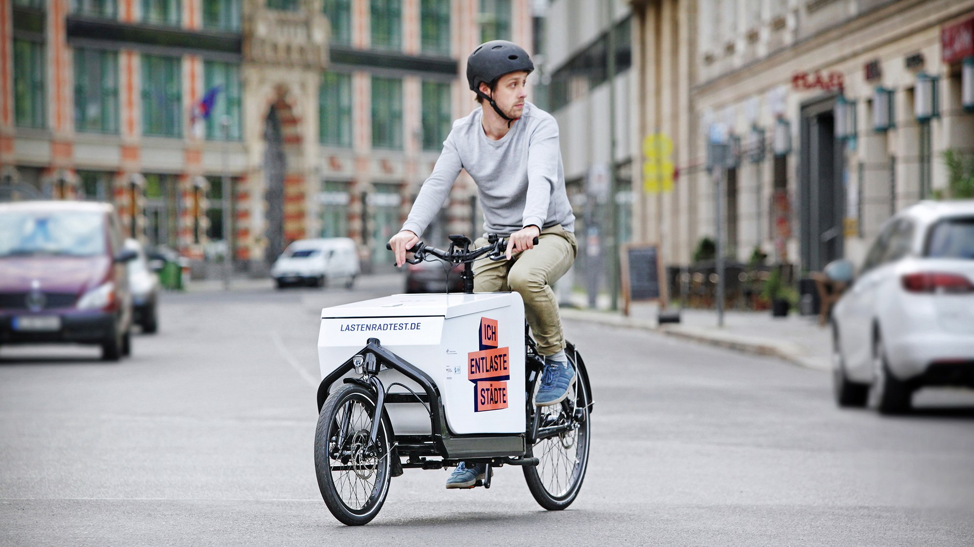 Im Pilotprojekt "Ich entlaste Städte" können Unternehmen und Einrichtungen bundesweit eines der 150 E-Lastenräder in einem rund dreimonatigen Test ausprobieren.