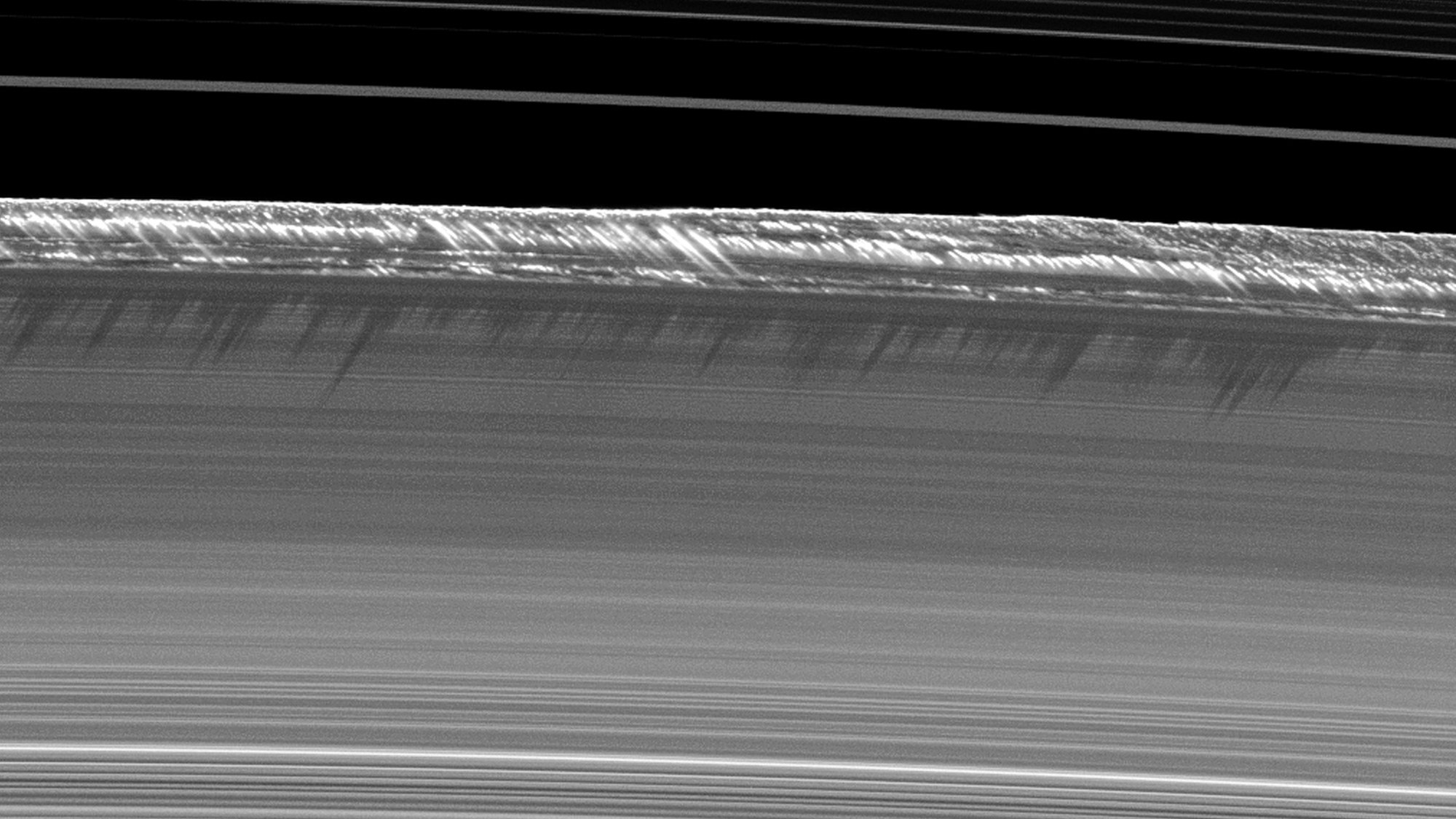 An der Cassinischen Teilung, dem Übergang vom B-Ring zum weiter außen gelegenen A-Ring, stauen sich Ringepartikel und bilden ein 2500 Meter hohes "Gebirge" am Rand der ansonsten nur hundert Meter bis maximal einen Kilometer mächtigen Saturnringe. Aufgenommen während der Tag-und-Nacht-Gleiche um die nördliche Frühlingssonnwende, trifft das Sonnenlicht fast horizontal auf die Ringe und lässt die Erhebungen lange, spitze Schatten auf die Ringe werfen. Die Ursache für die Struktur dürfte in noch unentdeckten winzigen Monden liegen, die dort ihre Bahnen ziehen.