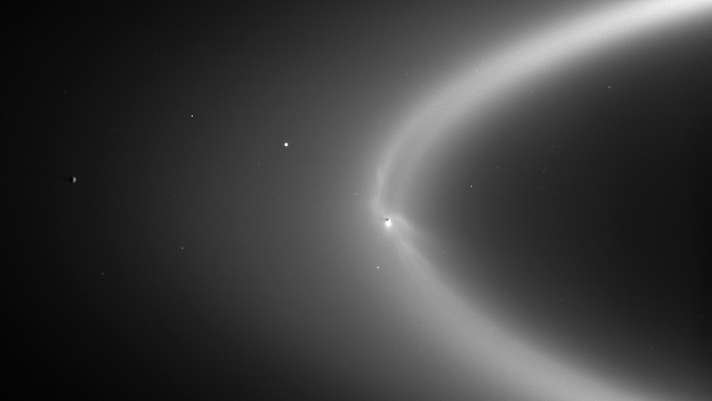 Saturns breiter und diffuser E-Ring besteht hauptsächlich aus mikroskopisch kleinen silikatischen Staubteilchen und winzigen Eiskörnchen von Wasser, Kohlendioxid und Ammoniak, die etwa ein Tausendstel eines Millimeters groß sind. Diese Teilchen sind kleiner als rote Blutkörperchen - mit dem Cosmic Dust Analyzer auf der Cassini-Raumsonde aber mühelos aufzuspüren. Der E-Ring ist der zweitäußerste Ring des Saturn und erstreckt sich zwischen den Umlaufbahnen von Mimas und Titan bis in eine Entfernung von fast einer Million Kilometer vom Saturnmittelpunkt. Anders als die hauchdünnen Hauptringe A bis G gleicht der E-Ring mit einer Dicke von 2000 Kilometern eher einem Wulst. Der helle Punkt auf dem Bild ist Enceladus, dessen Kryovulkane den E-Ring mit kleinen Eisteilchen versorgen.