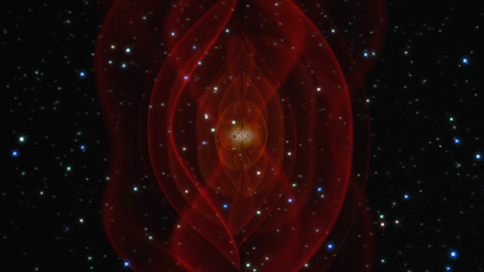 Computersimulation der abgestrahlten Gravitationswellen von zwei miteinander verschmelzenden Schwarzen Löchern: Die Technologiedemonstration LISA Pathfinder hat den Weg geebnet, um ab 2034 mit dem Observatorium LISA Gravitationswellen direkt im Weltall zu untersuchen. Die mit LISA zu beobachtenden Gravitationswellen sind von der Erde aus nicht nachzuweisen, da sie dort unter anderem durch seismische Störungen vollständig überlagert werden.