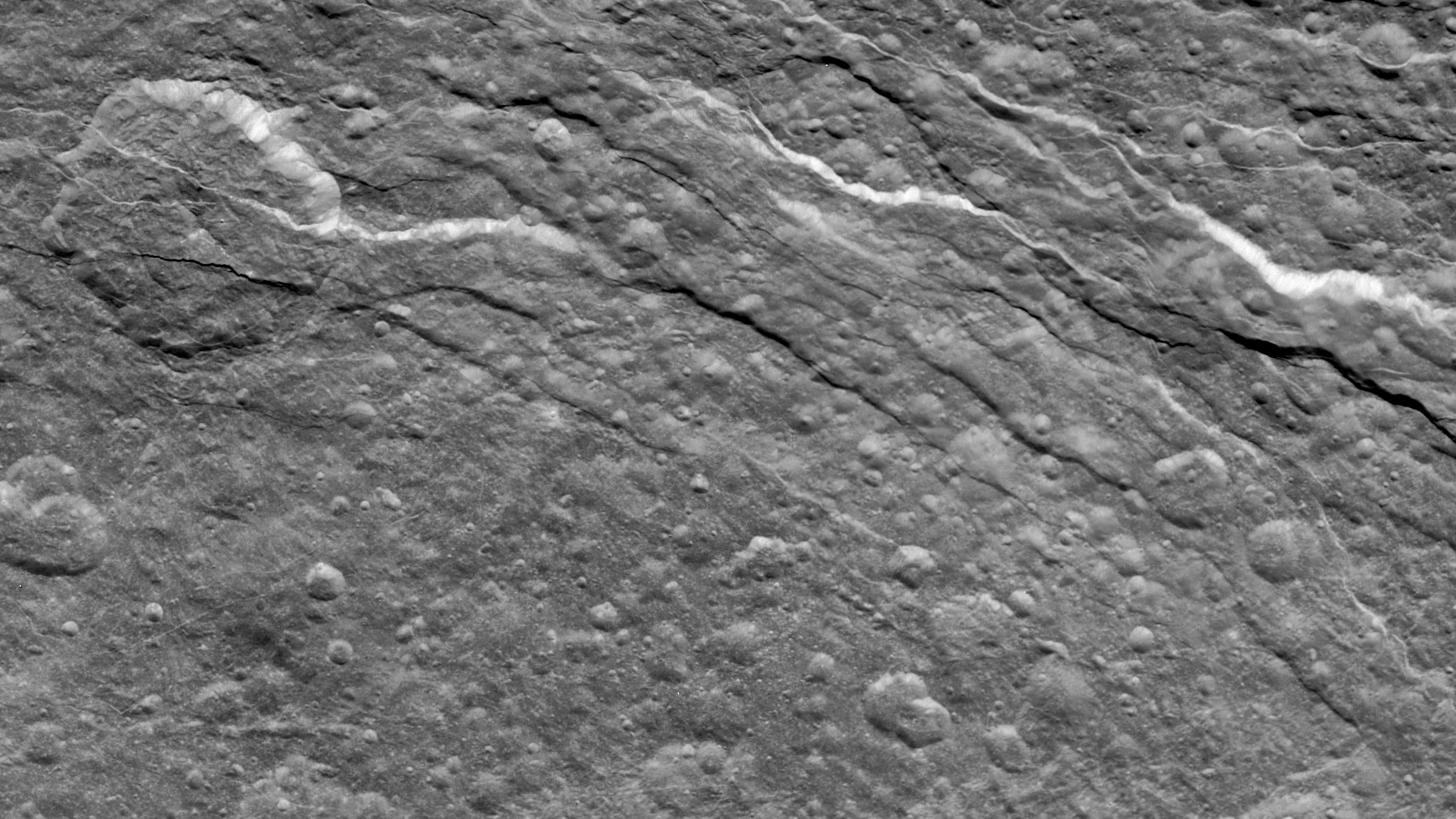 Die meisten der großen Monde, sieht man von Enceladus und Titan ab, zeigen sehr alte, von Tausenden von Kratern übersäte Oberflächen. Zahlreiche, teilweise über mehr als hundert Kilometer lange linienartige Strukturen lassen erkennen, dass diese Monde, wie in diesem Beispiel der mit einem Durchmesser von 1530 Kilometern zweitgrößte Mond Rhea, unter starken mechanischen Spannungen standen und dieser "Stress" sich in Bruchstrukturen entlud.