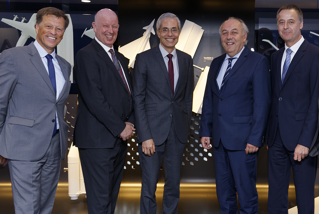 Matthias Machnig (2. von rechts) würdigte im Rahmen einer Feierstunde in Berlin den Erfolg der deutschen Erdbeobachtungsmissionen TerraSAR-X und TanDEM-X. TerraSAR-X startete vor zehn Jahren ins All - als ein öffentlich-privates Partnerschaftsprojekt von DLR und Airbus. Mit im Bild (von links): Airbus-Vorstand Dr. Johannes von Thadden, Dr. Gerd Gruppe, Vorstand des DLR Raumfahrtmanagements, Prof. Alberto Moreira, Direktor des DLR Instituts für Hochfrequenztechnik und Radarsysteme und Eckard Settelmeyer, Airbus-Direktor für Erdbeobachtung und Navigation.